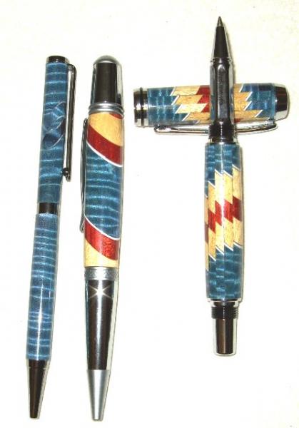 Here are some close ups of some pens from my last post, the slimline is blue curly maple with a coke can segment, the sierra are just the scraps from the baron which is my first attempt of that design it isnt perfect(one is glued out of order) and there are some things i will fix next time, it is yellowheart, blood wood, blue curly maple and a walmart gift card. i dont know why the yellow heart looks so grainy it doesnt in person i might post another photo but dont hold me to it