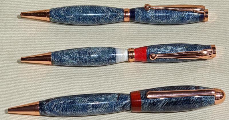 About two and a half years ago I saw my first demonstration of pen turning, it was on making a pen out of cloth. Six months after the demonstration I got a lathe and decided to try my hand at making one out of blue jeans. My wife got that one (the one on top) I have made several since then using different materials. I offered to do a demonstration at the September Pen Club meeting which is where the bottom two came from. Comments and Criticisms are welcomed.