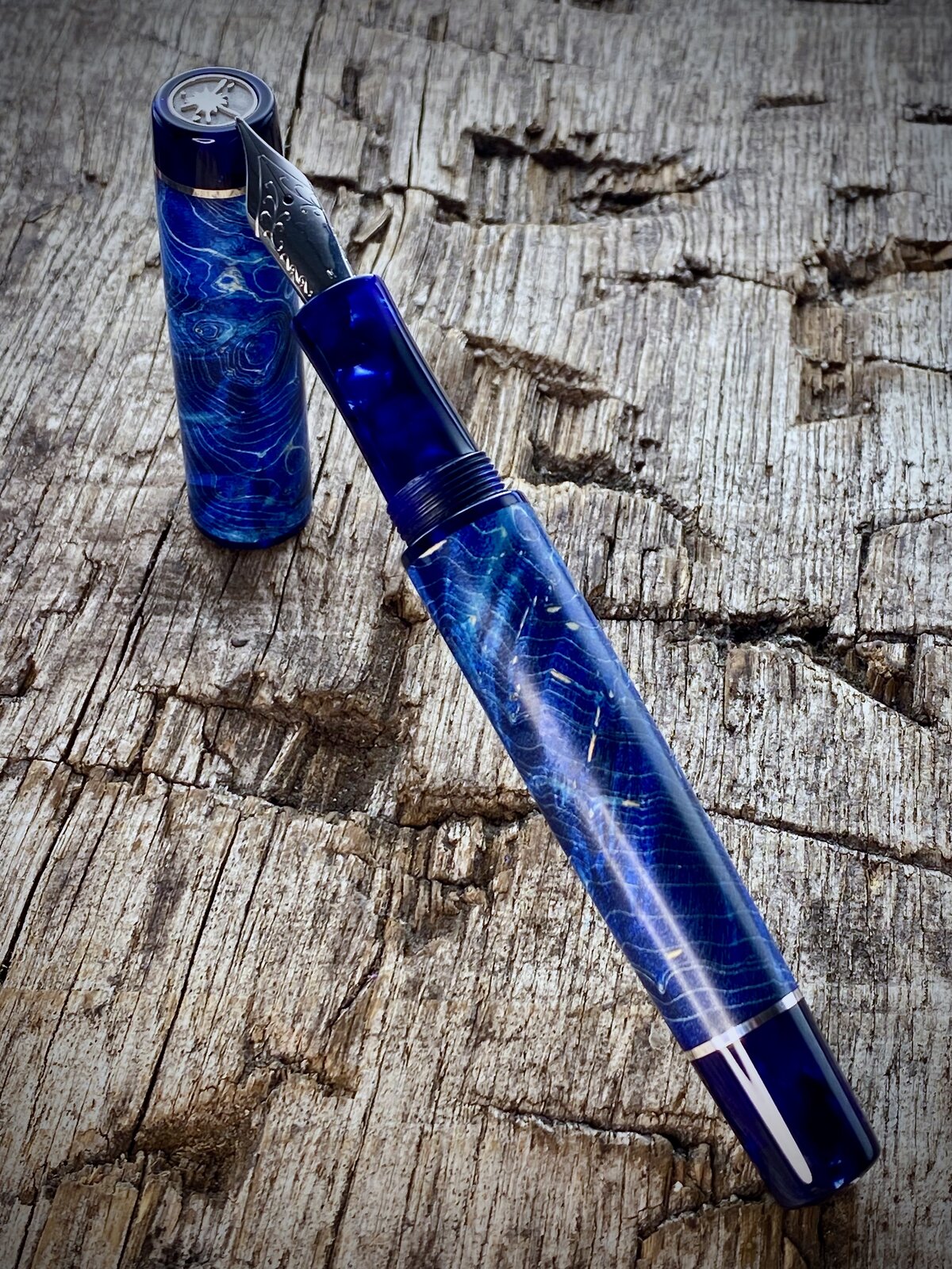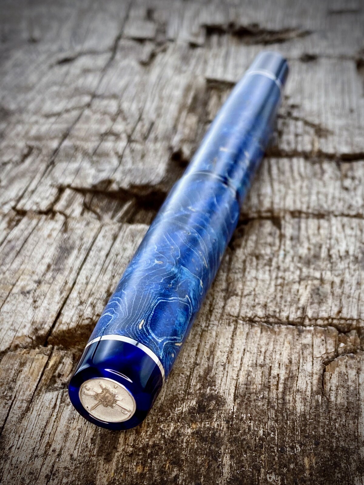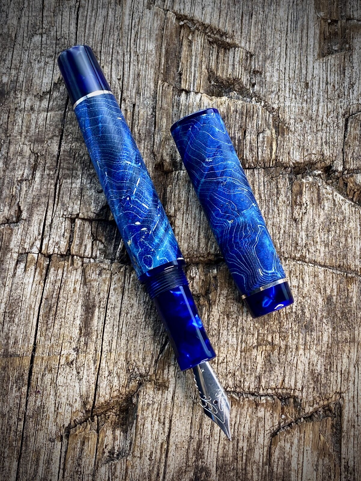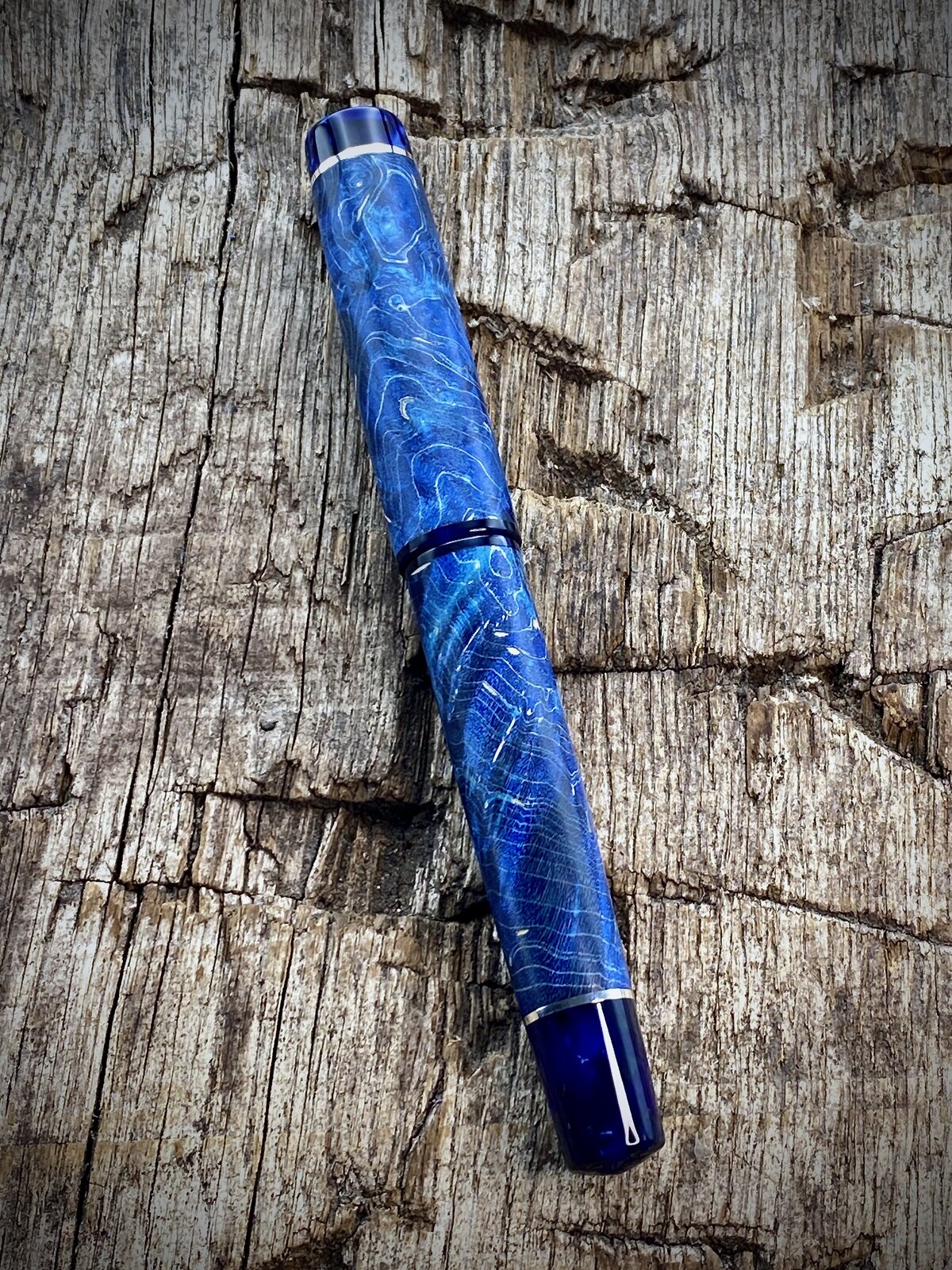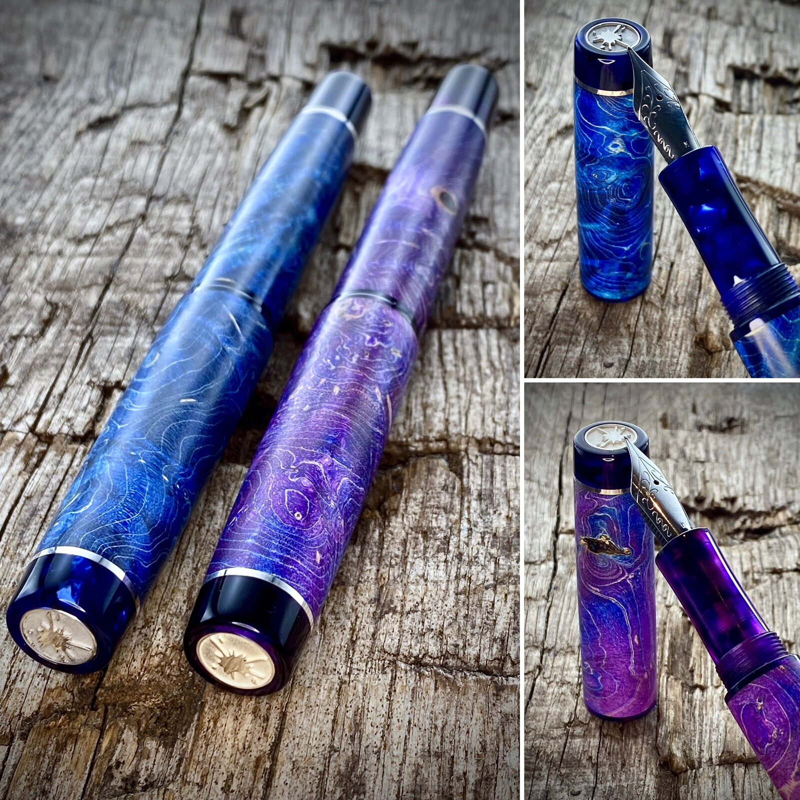 This is a blue maple burr (burl) fountain pen with cellulose acetate accents that just arrived with the customer. These are very popular pens but I try not to make too many. The last picture shows the purple equivalent I offer and I also make a green one.