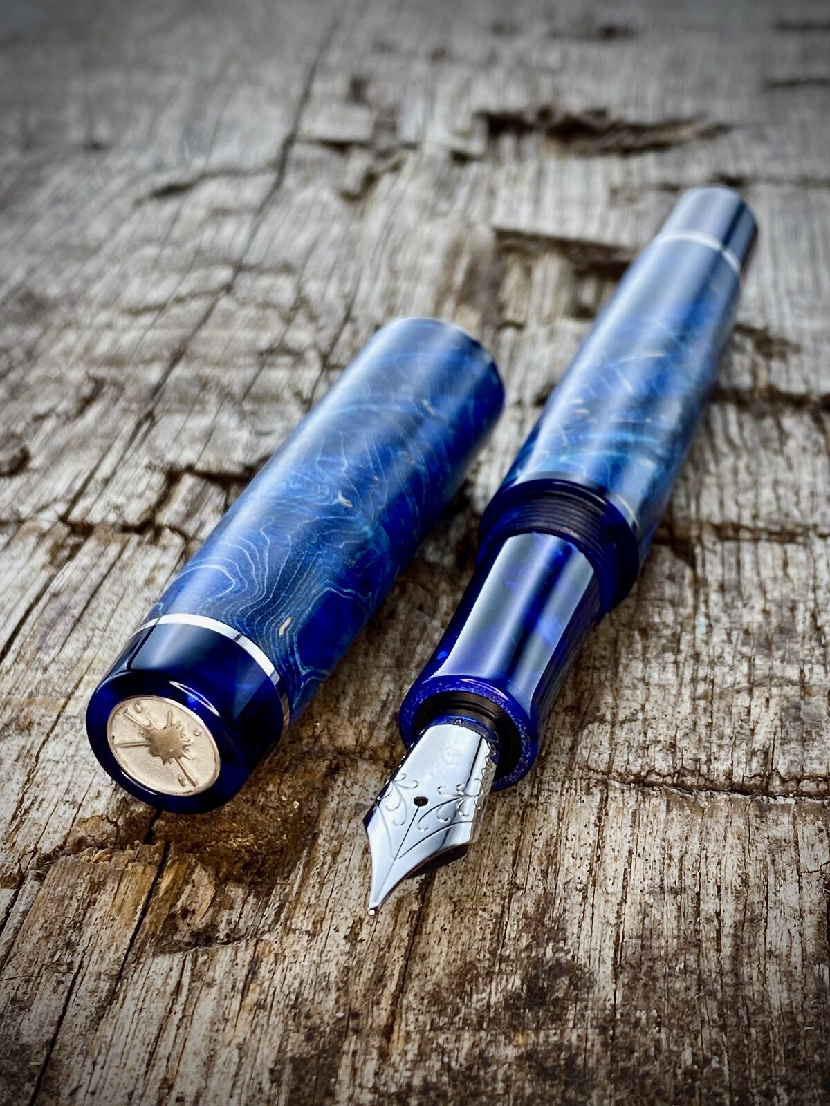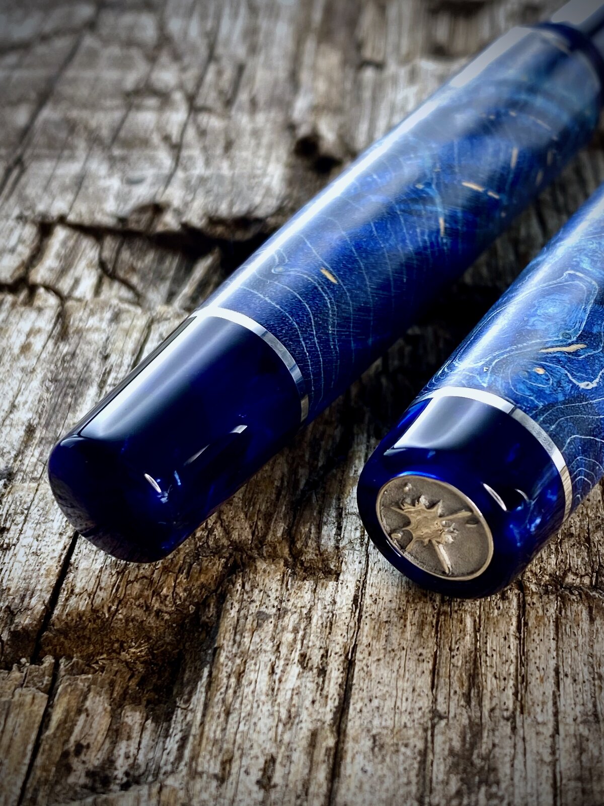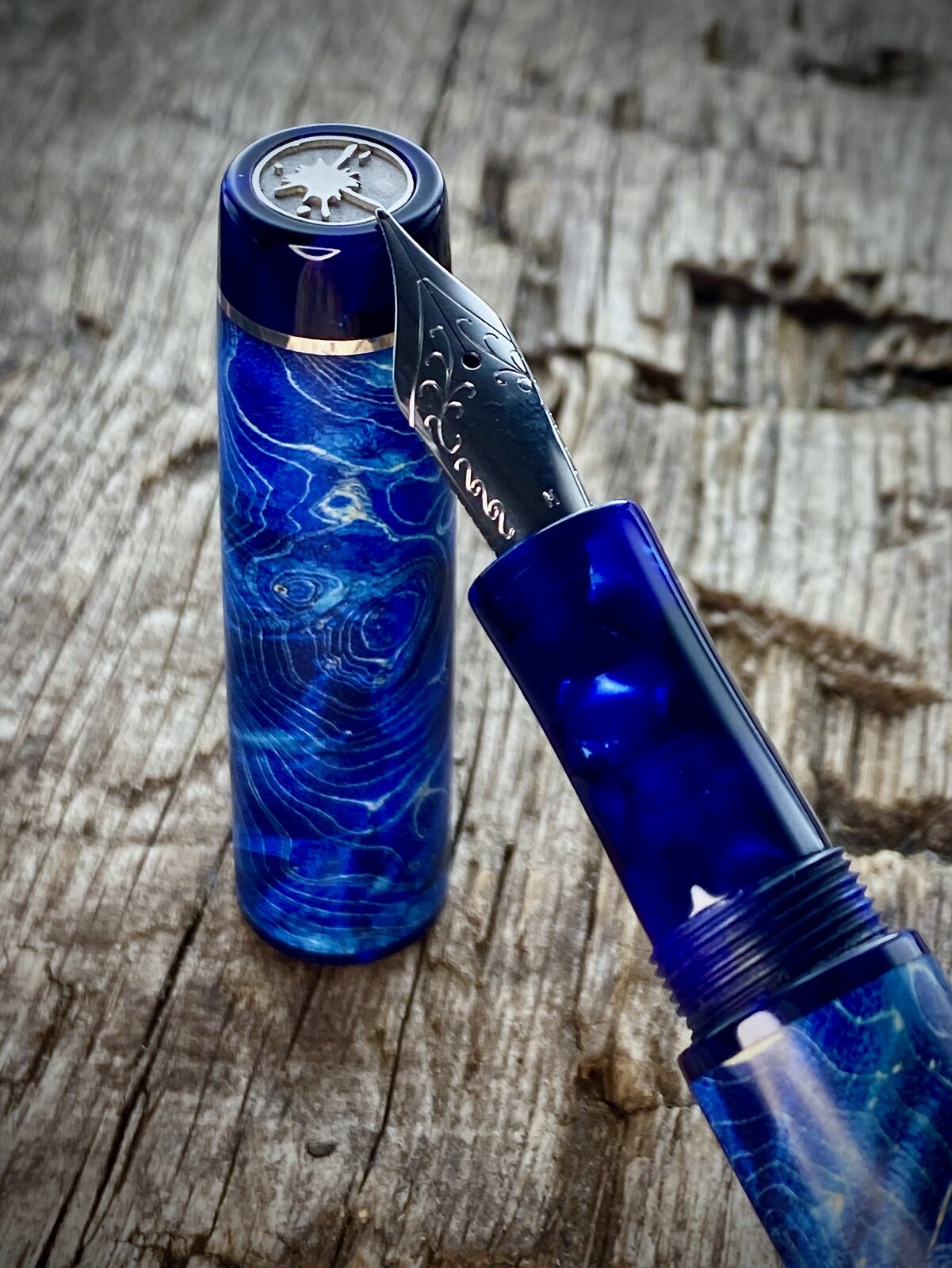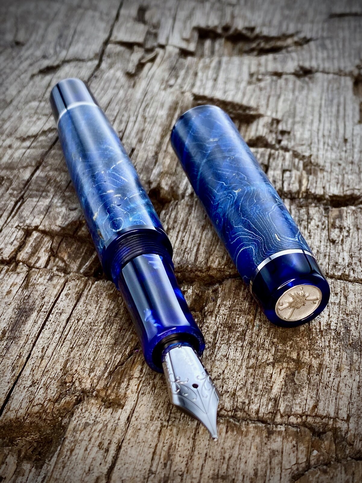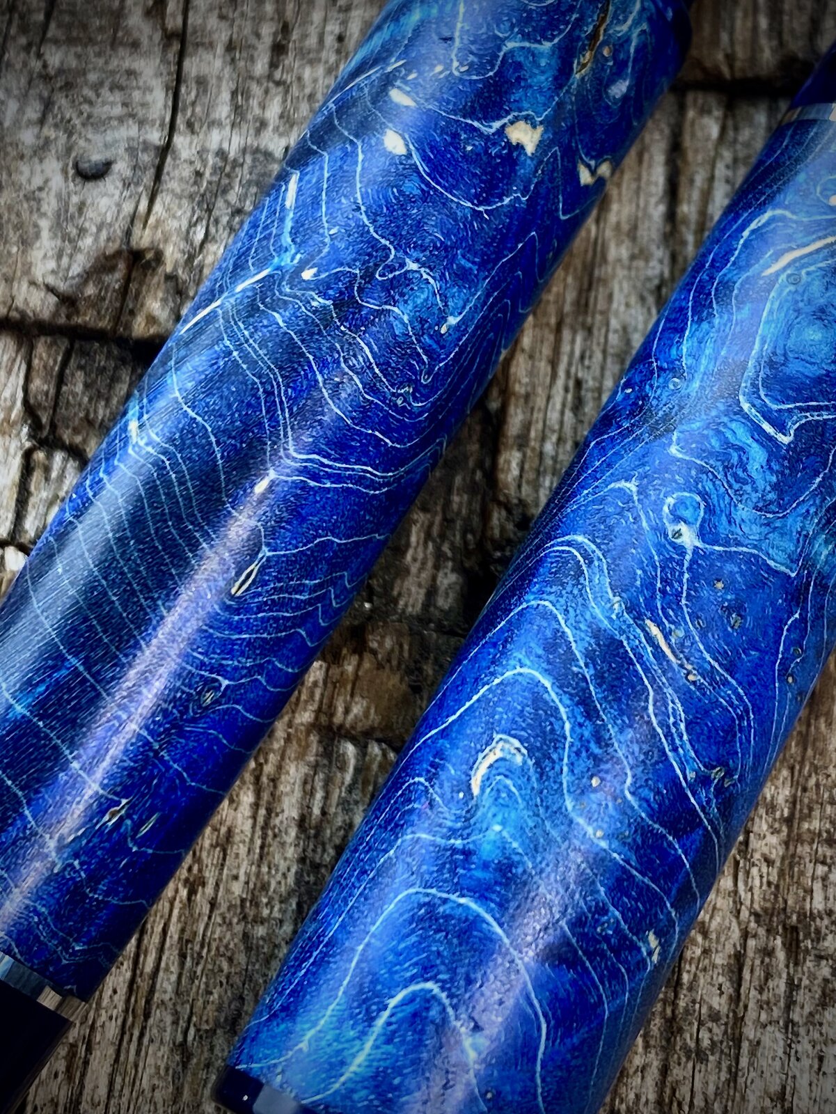 This is a blue maple burr (burl) fountain pen with cellulose acetate accents that just arrived with the customer. These are very popular pens but I try not to make too many. The last picture shows the purple equivalent I offer and I also make a green one.