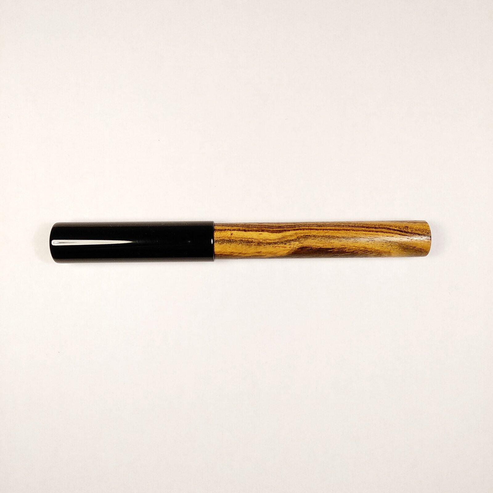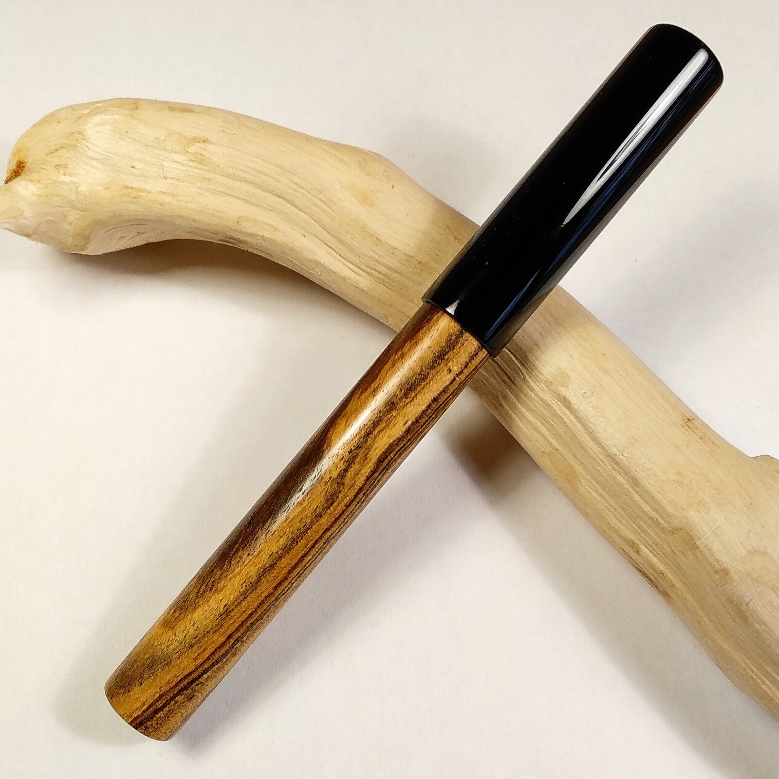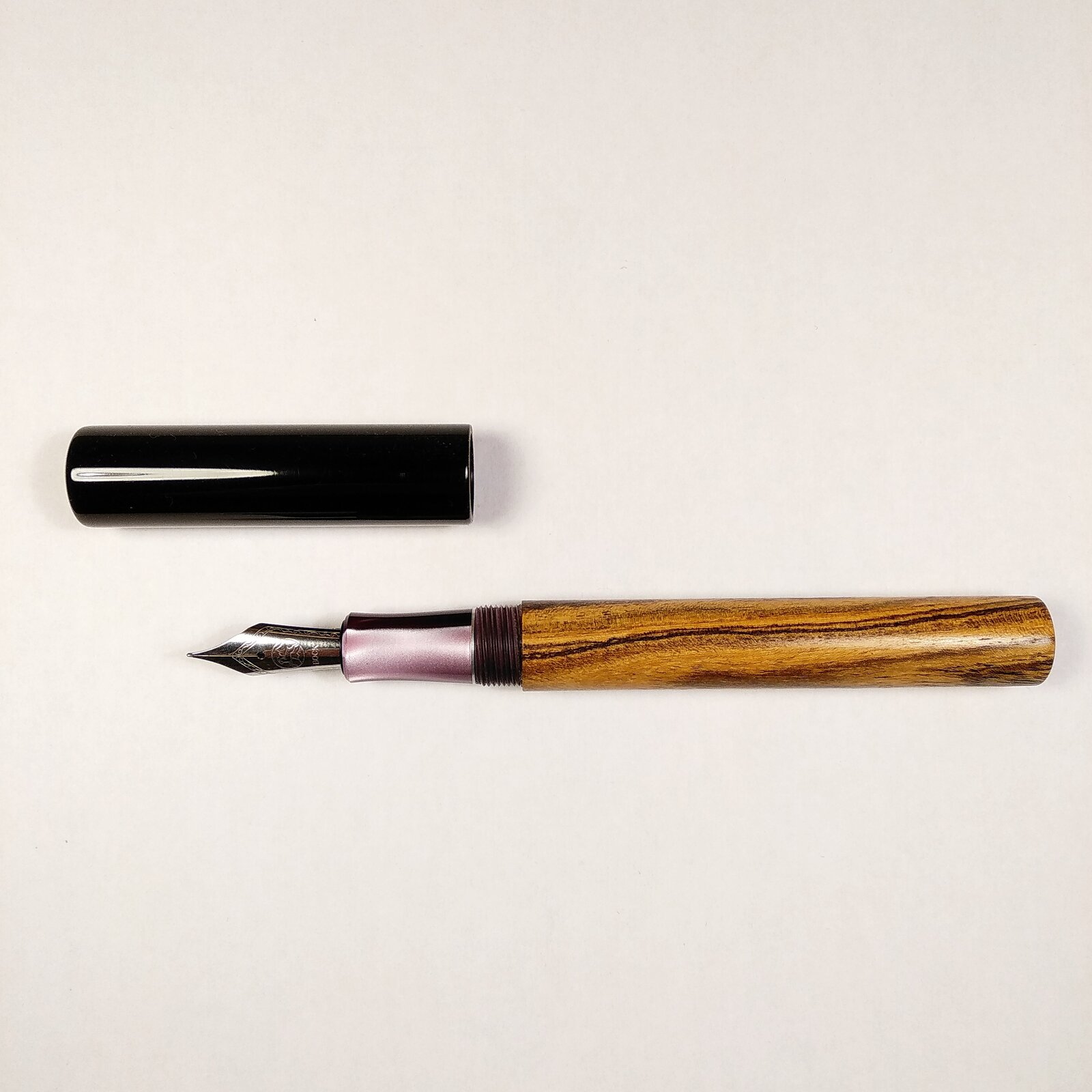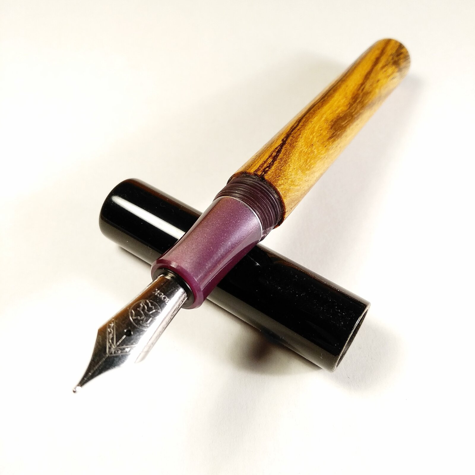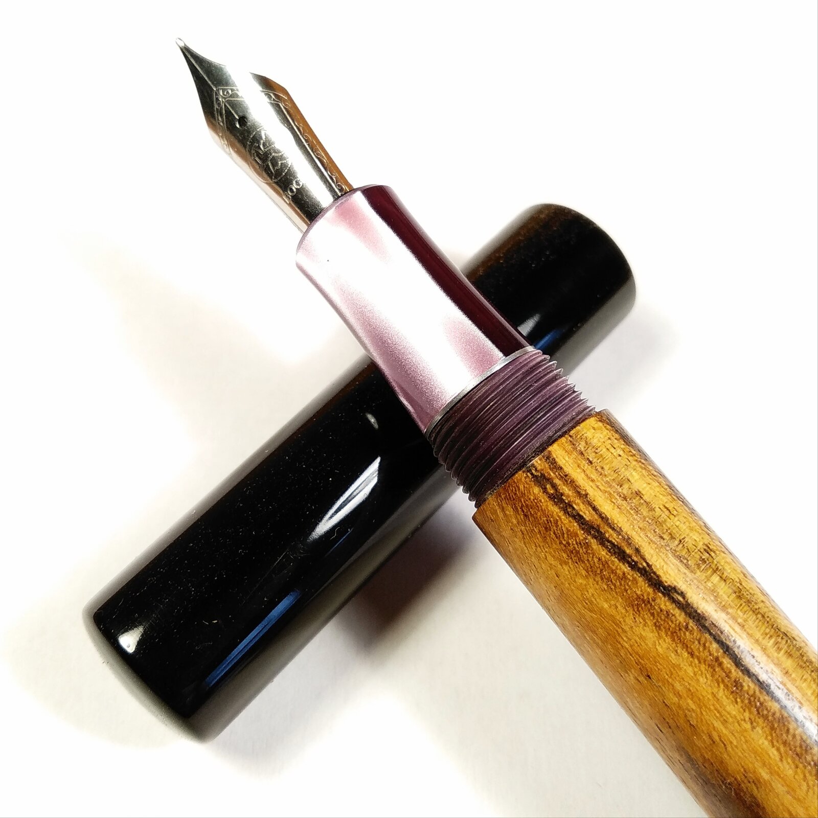 A quite simple one this time: bocote wood and fine black ebonite. Pearl purple kirinite section and barrel sleeve, aluminum ring accent. Full ebonite cap with glossy finish. Weight: 23g, length: 142mm. 16mm cap diameter, 14mm barrel diameter. It features a Bock #6 nib and an international standard converter. Melamine satin finish for the barrel.