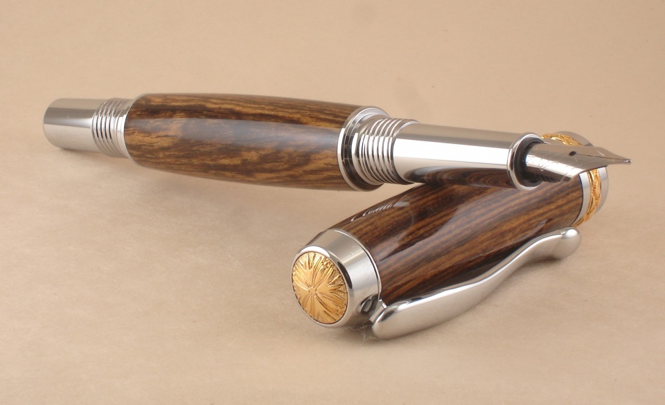Ti/Gold and Chrome Triton dressed is Bocote, finished using my Rustoleum dipping method. I upgraded the nib to a 5mm polished Bock nib purchased during the Bash. I also would like to thank Roy and Dee at The Classic Nib for offering their discount during the Bash. Thanks for looking,