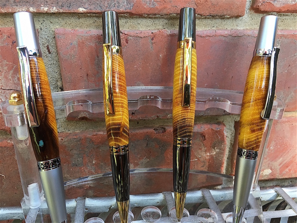 A friend gave me an old Bodarc (Osage Orange) fence post and asked me to make 4 pens. I decided the cross-grain is by far the best looking (though more difficult to turn) and the one on left - though there was a big black knot - turned out really nice. Which is your favorite?