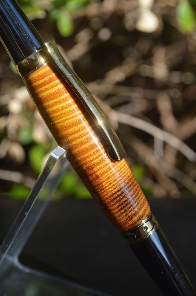 Ok - here's another Bodark pen (aka Osage Orange or Hedge) but it is cross-grain. First one blew up on me so i took the second really slow with lights cuts and it turned out really nice (IMHO). This is also the new Ellipse pen from Exotic Blanks. Very similar to the Wall St II or Sierra but with some added options for the refill. As always - comments & critiques welcome (and encouraged).