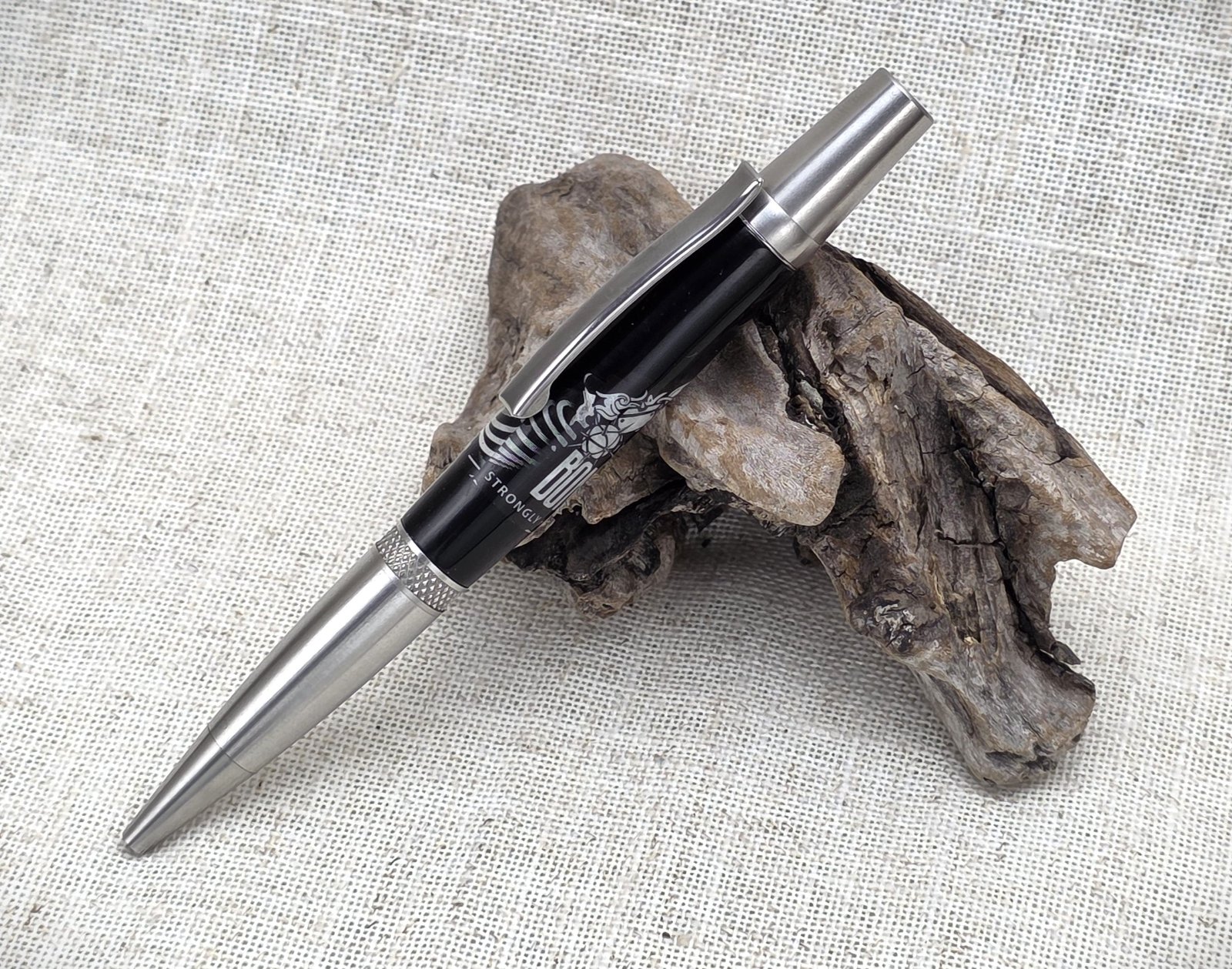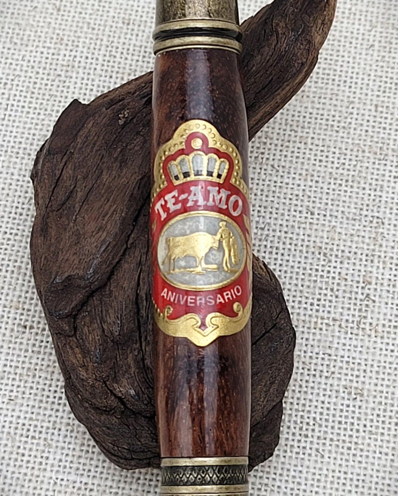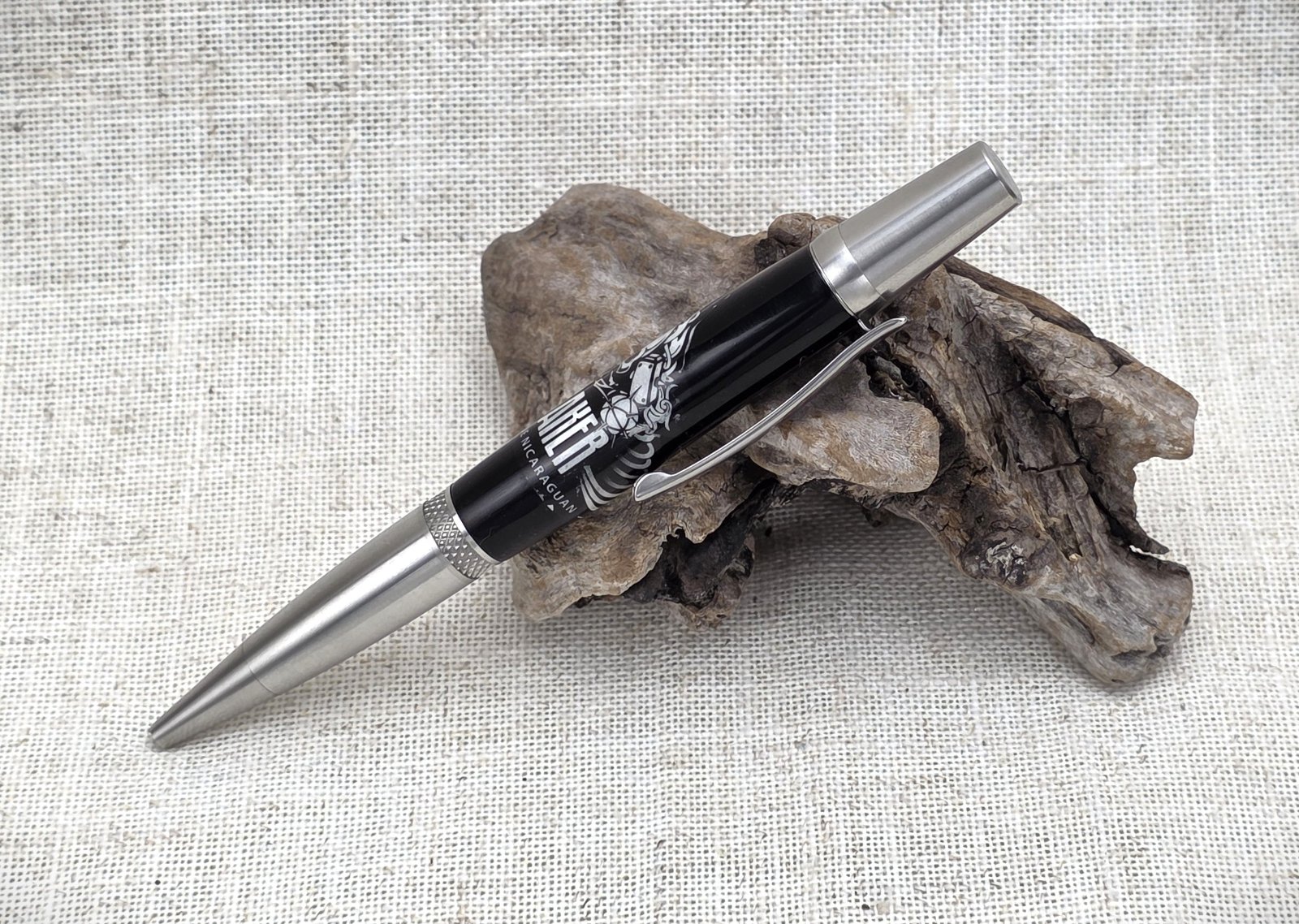Here's me messing around with some cigar labels again. This is a Diamond Knurl stainless steel ballpoint in ebony. The wood and label seemed to go well together. I got the ends of the cigar band to meet up nicely, but finishing was a little tricky, certainly not my best work, but I think it's pretty cool anyway. "Strongly Handmade Nicaraguan", whatever that is. (I'm not a smoker, but I love the smell of a good cigar. Until you light it, that is.)