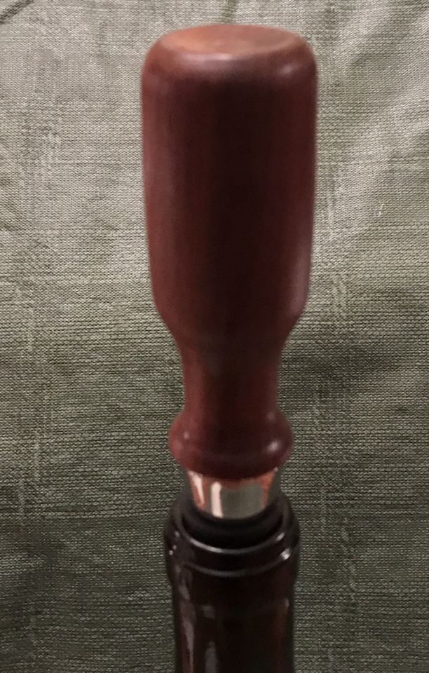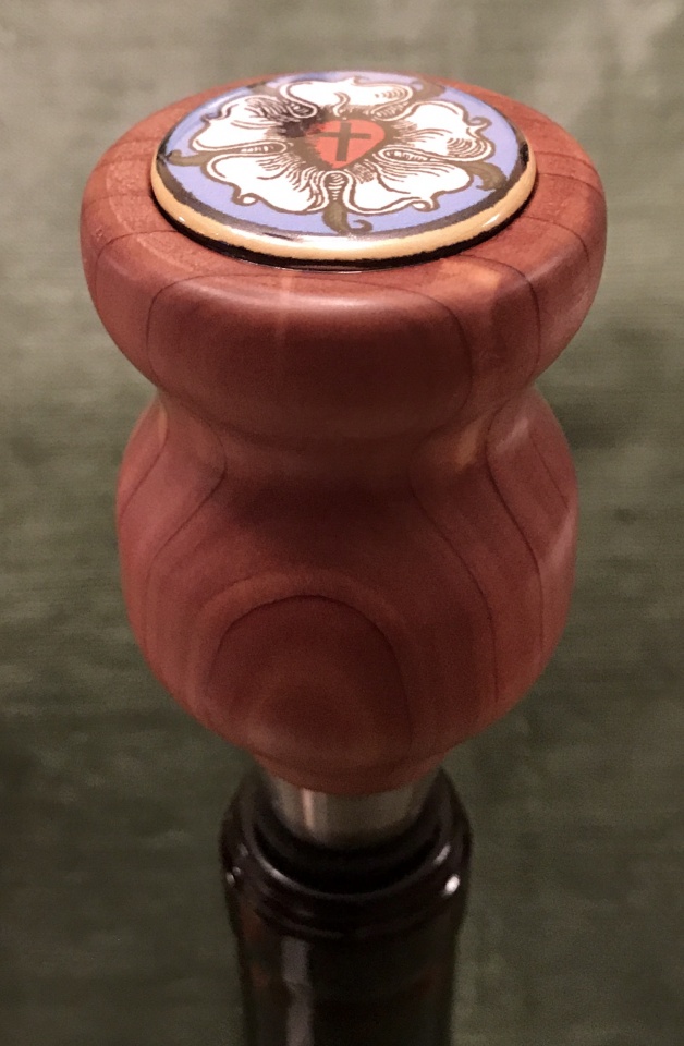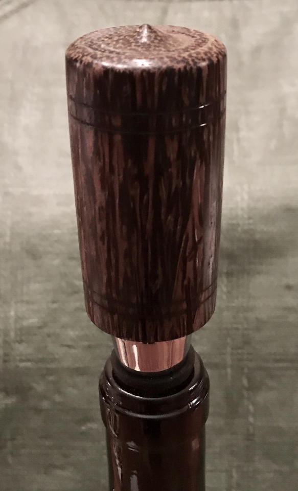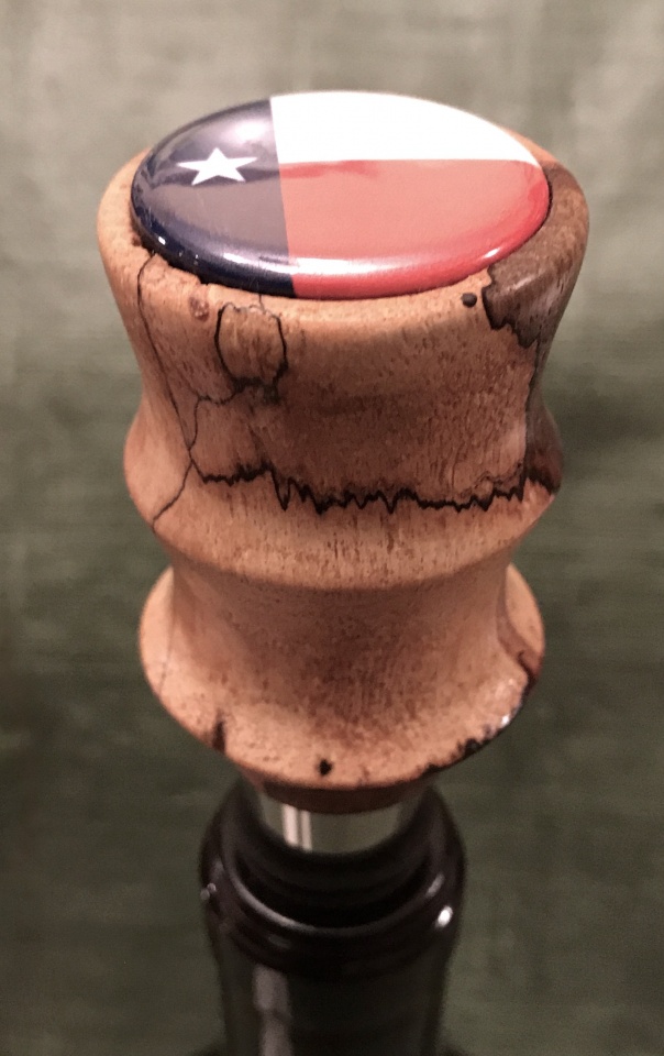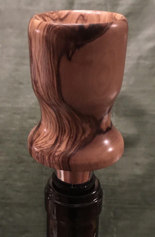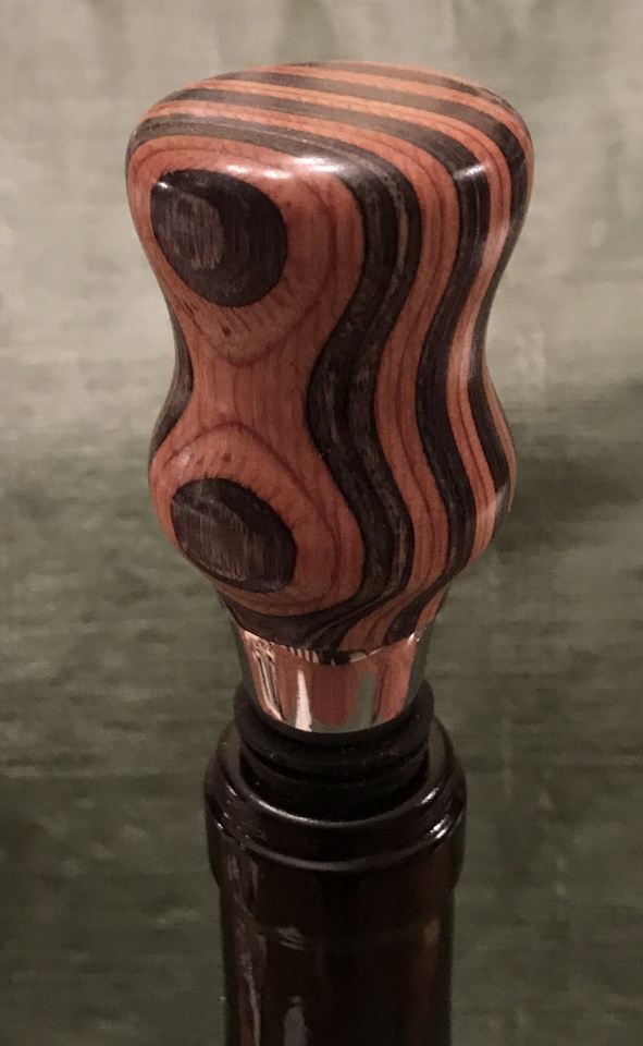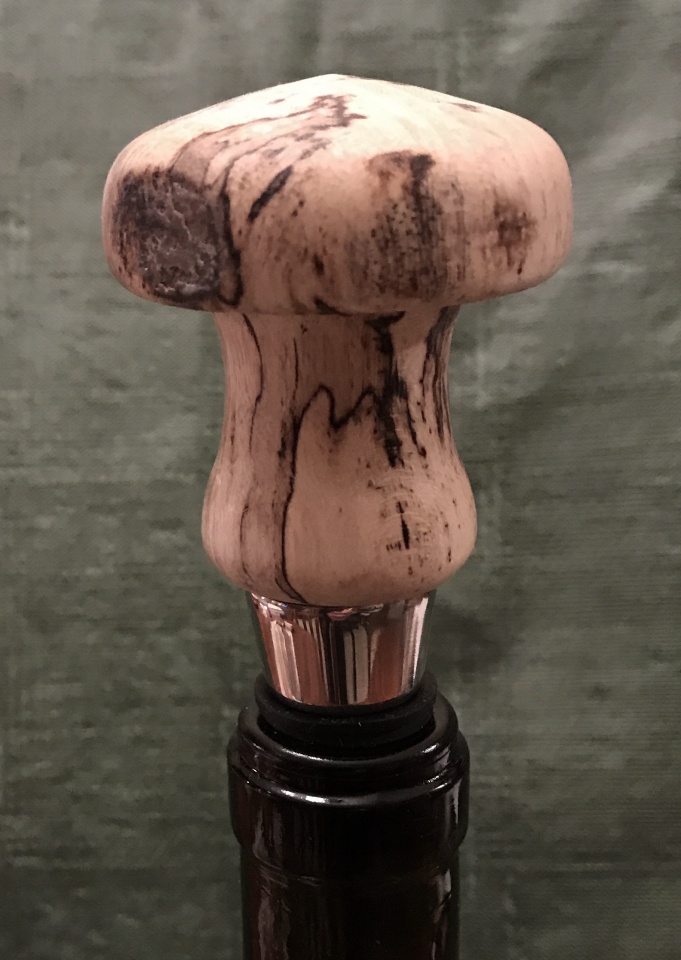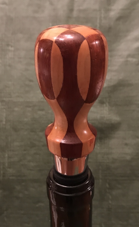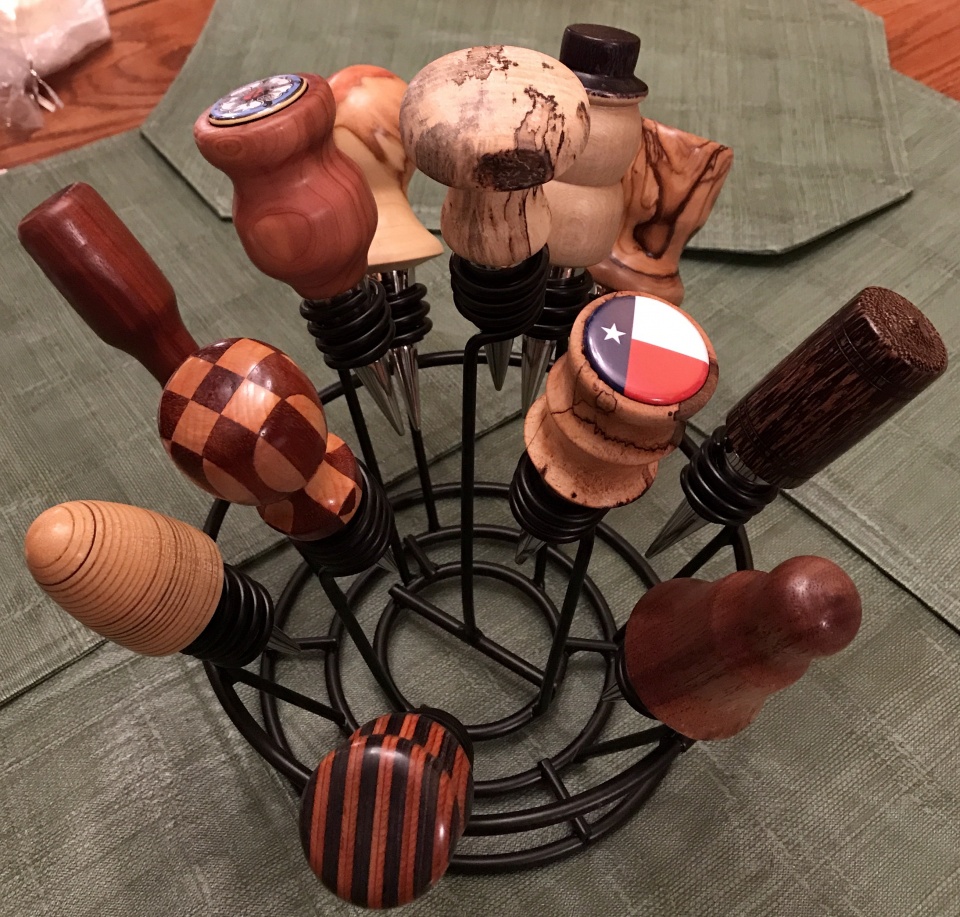 There are 12 stoppers in the bouquet: Mushroom from Spalted Hackberry, Hot Air Balloon from a Maple & Padauk laminate, Goblet from Bethlehem Olive Wood, Beehive from African Avoidre, Bottle from Purple Heart, Snowman from American Holly, Lutheran Stopper from Cedar, Texas Stopper from Pecan, Bell from Hawaiian Kia, Random Shape from Spectraply, Whiskey Barrel from Black Palm & a World Globe from Flaming Box Elder.