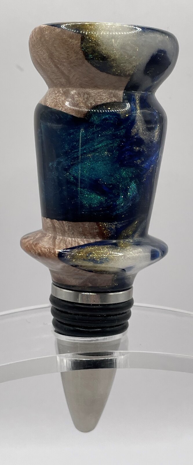 I am loving the pen and bottle stopper blanks I am getting from Jake Thompson!! Here is an Alumilite Resin Multi Color Swirl with Glitter blank I turned into a Bottle stopper with a Ruth Niles SS Stopper.