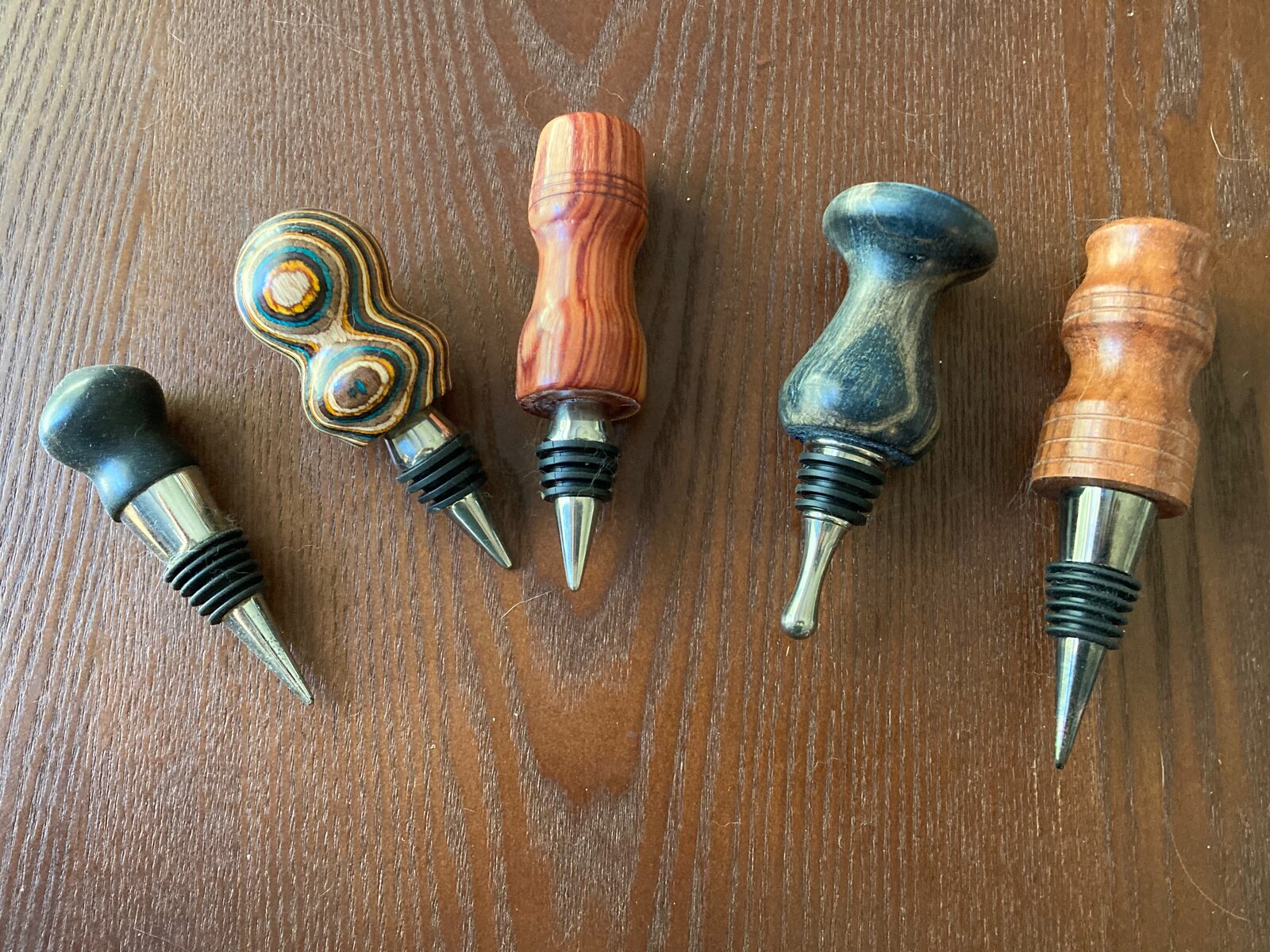 Left to right….. Ebony, Dyed Laminated, Tulipwood, Dyed Stabilized Box Elder, I Have No Idea. Using the glue-in threaded inserts so the stopper screws into turned blank. Glad someone thought to come up with the idea.