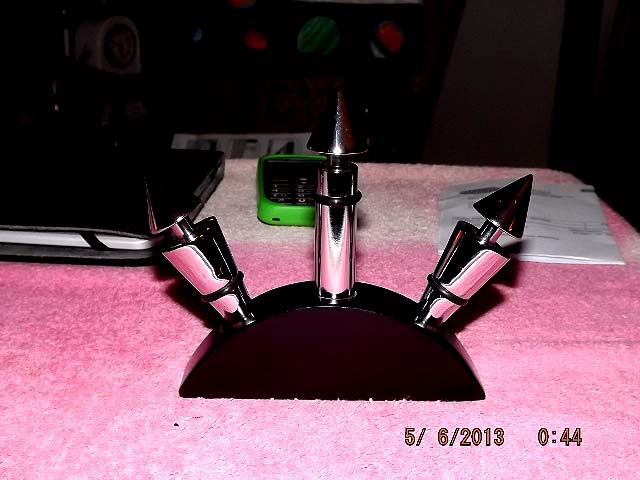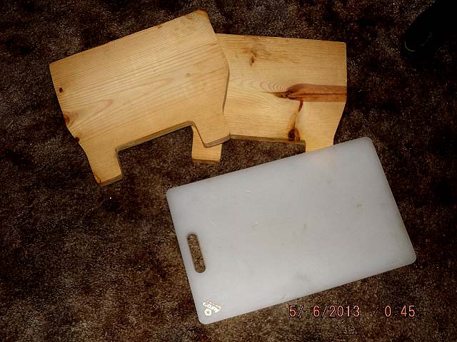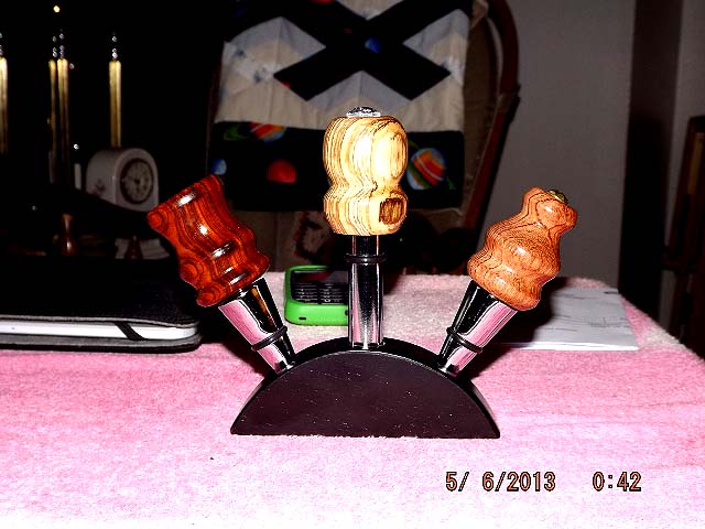I found these at t he Goodwill today and the hardware came with it as a set. The middle one is a bottle opener, like for a beer bottle or a soda bottle that doesn't have a twist off cap. I plan on making some thing similar. Any way, I unscrewed the little pointed ends and screwed on my own bottle stoppers I made and it really look sharp. Makes the whole thing look a lot better. So I think I can make a display stand similar to this one. The stand is made out of wood. Enjoy, oh I also found some wood I can use for making my pressure pot rack and a cutting board that I plan to make bottle stopper molds out of. That is in the last picture.. Fay