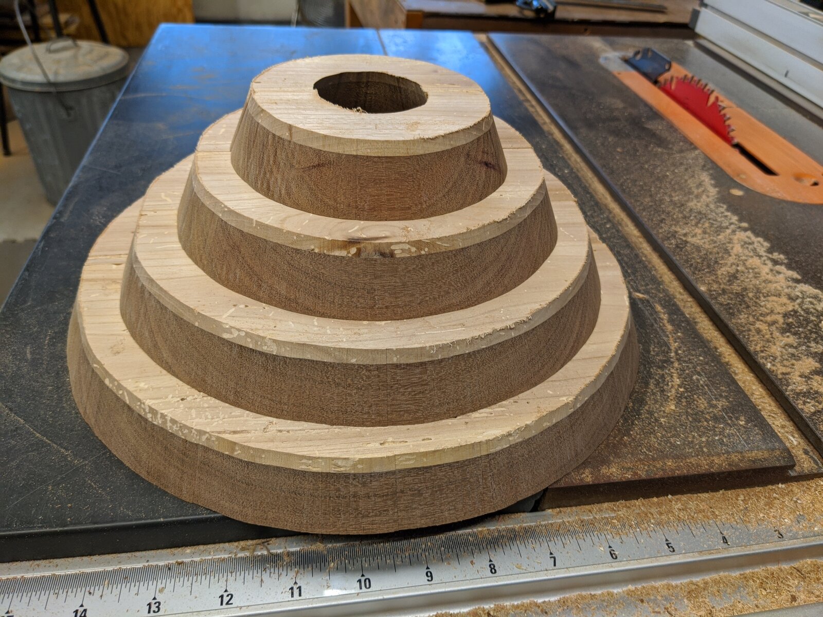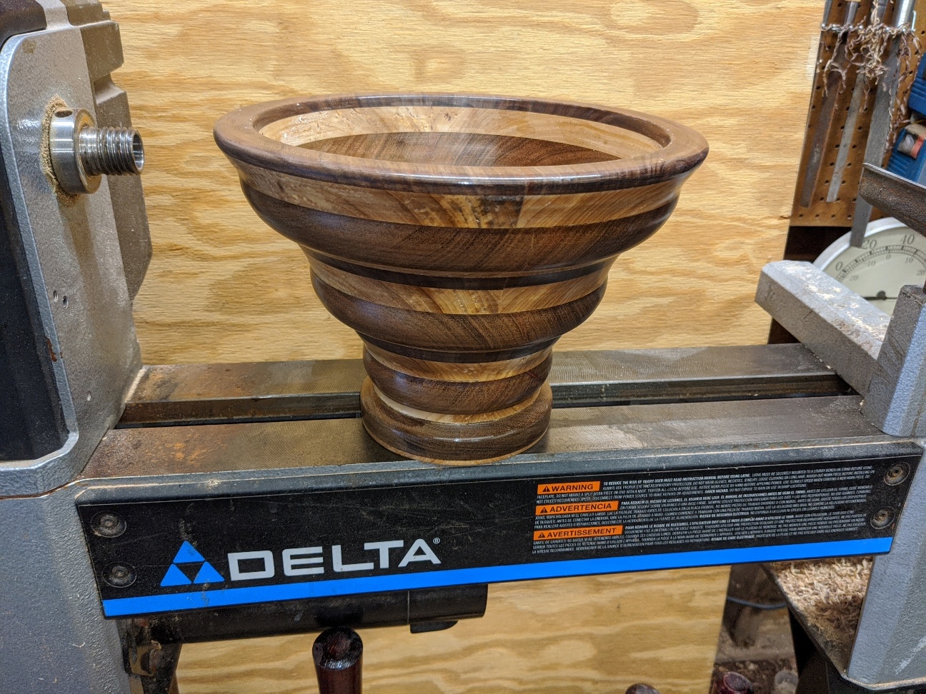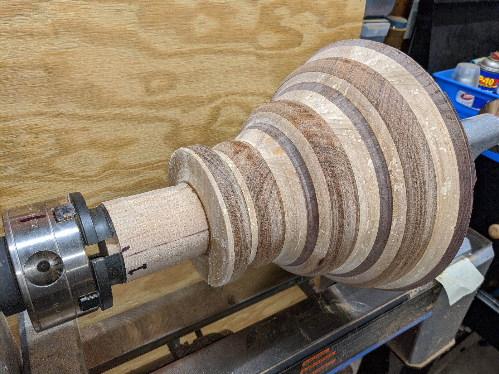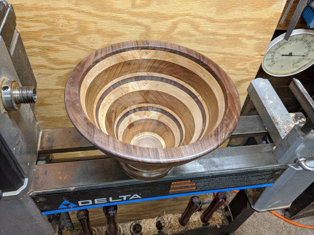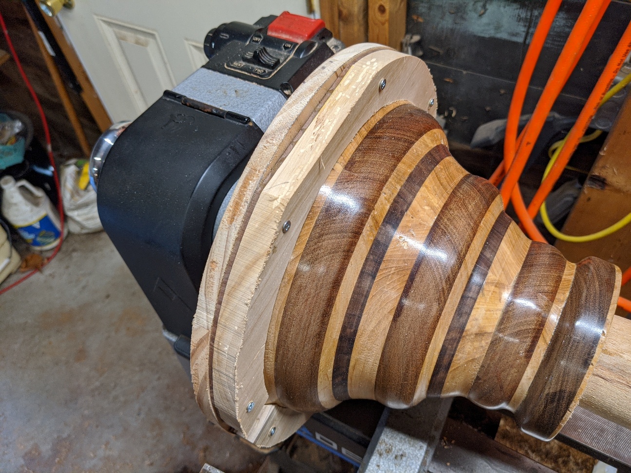 Started off as an experiment. Didn't exactly know all the requirements. Watched a few videos. Decided to experiment. Laminated some Mahogany to piece of Oak. Found I didnt have enough surface area to reliably glue it all together. Had to make take some Walnut and laminate it with some Cherry to make a few intermediary pieces. Figured I really screwed it up but said what the heck. Then I had to figure out how to hold this 11.5" diameter monster to remove the glue block and finish the bottom.