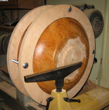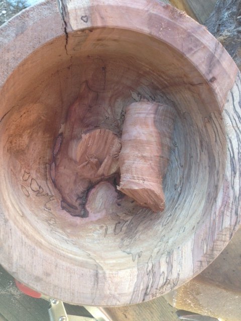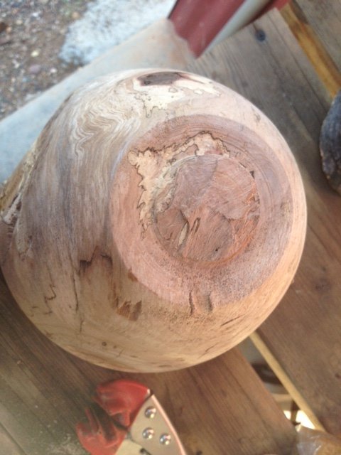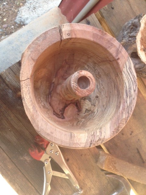 I started this splatted pecan bowl. Turned the outside and cut a tendon. When I turned it around I kept the tail stock up because it was heavy and still not quite balanced. As you can see in the pictures I hollowed around the center core. I had a catch and both the tendon and center core broke off and the bowl went flying.