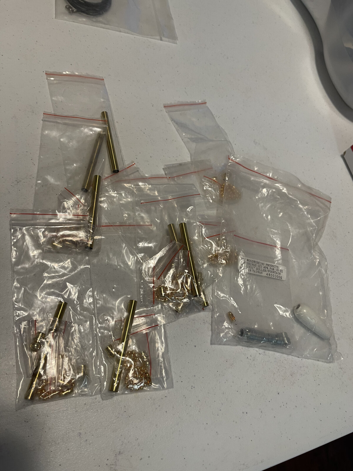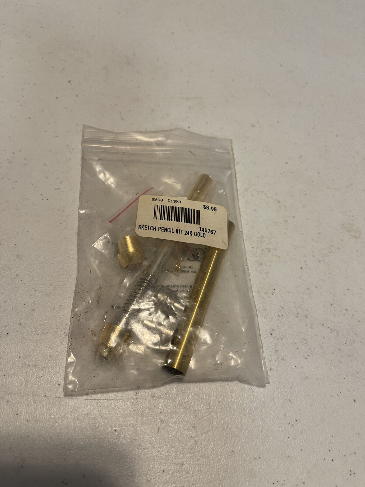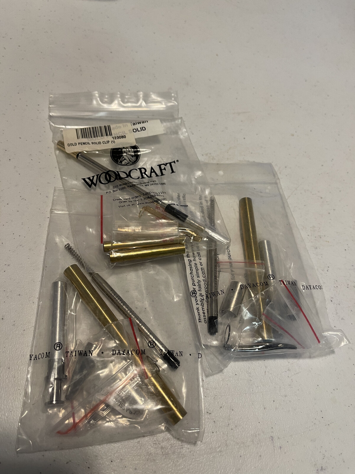 Box of assorted pen kits, projects and drill bits. Includes brushes for shaving, one razor kit, parts to make a cane, letter opener kits, ceiling fan pull kits, mini kaleidoscope kits with bushings and more. 1 unopened jar of pearlex colorant. What you see in the pictures is what you get. All shipped in USPS flat rate, CONUS, Paypal. $60.00.