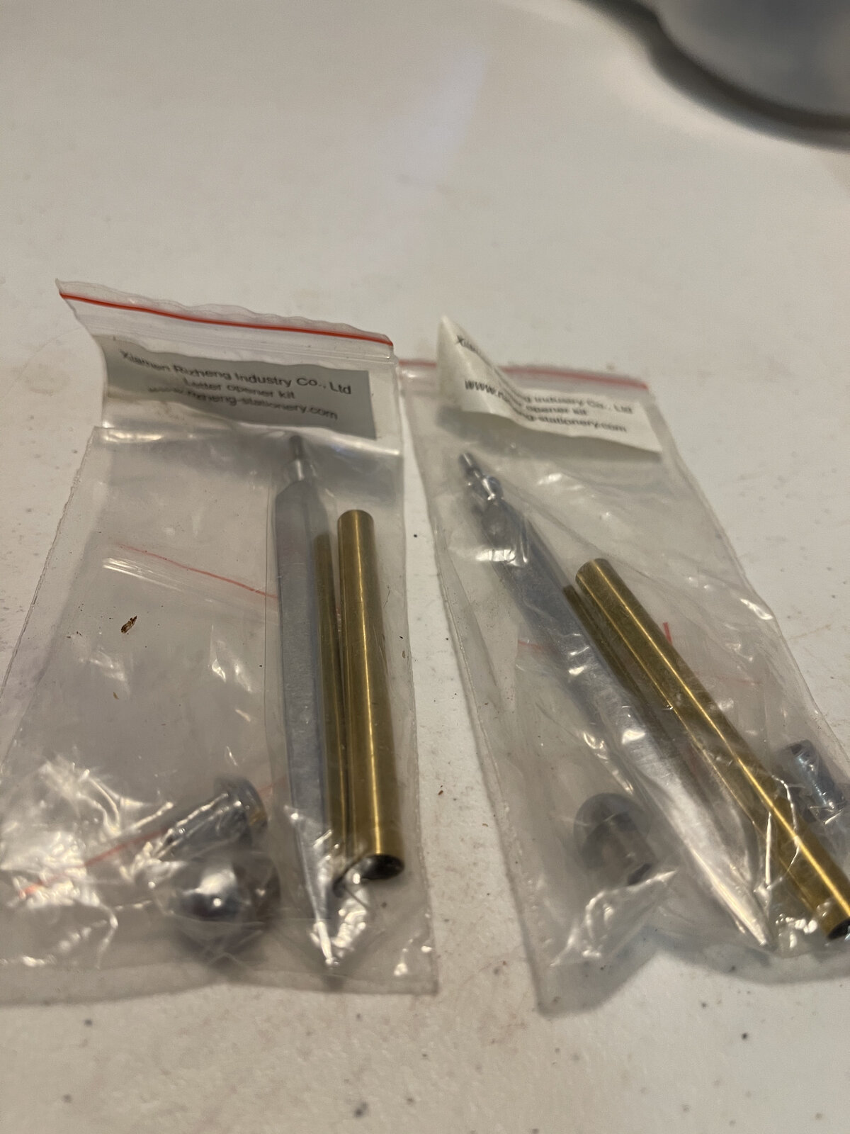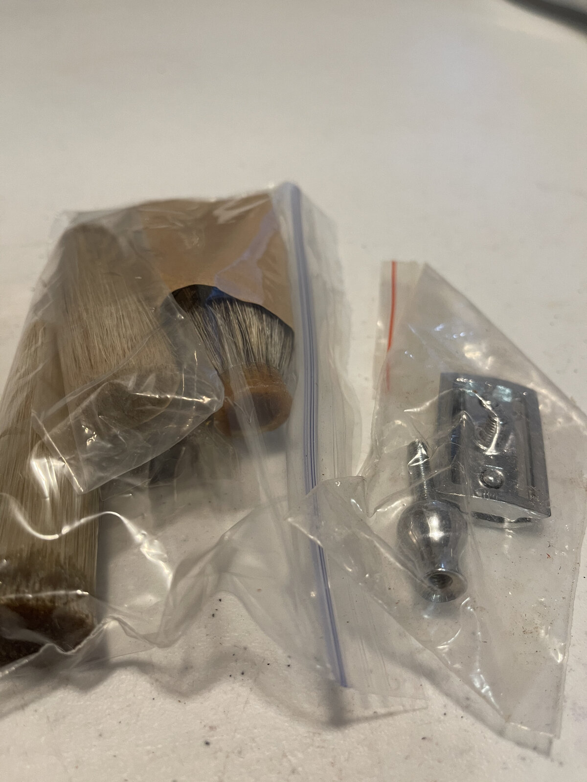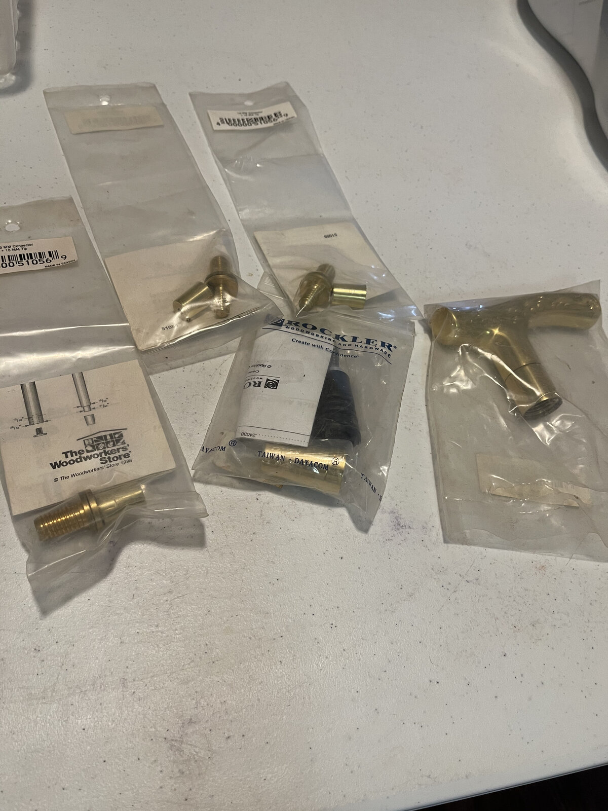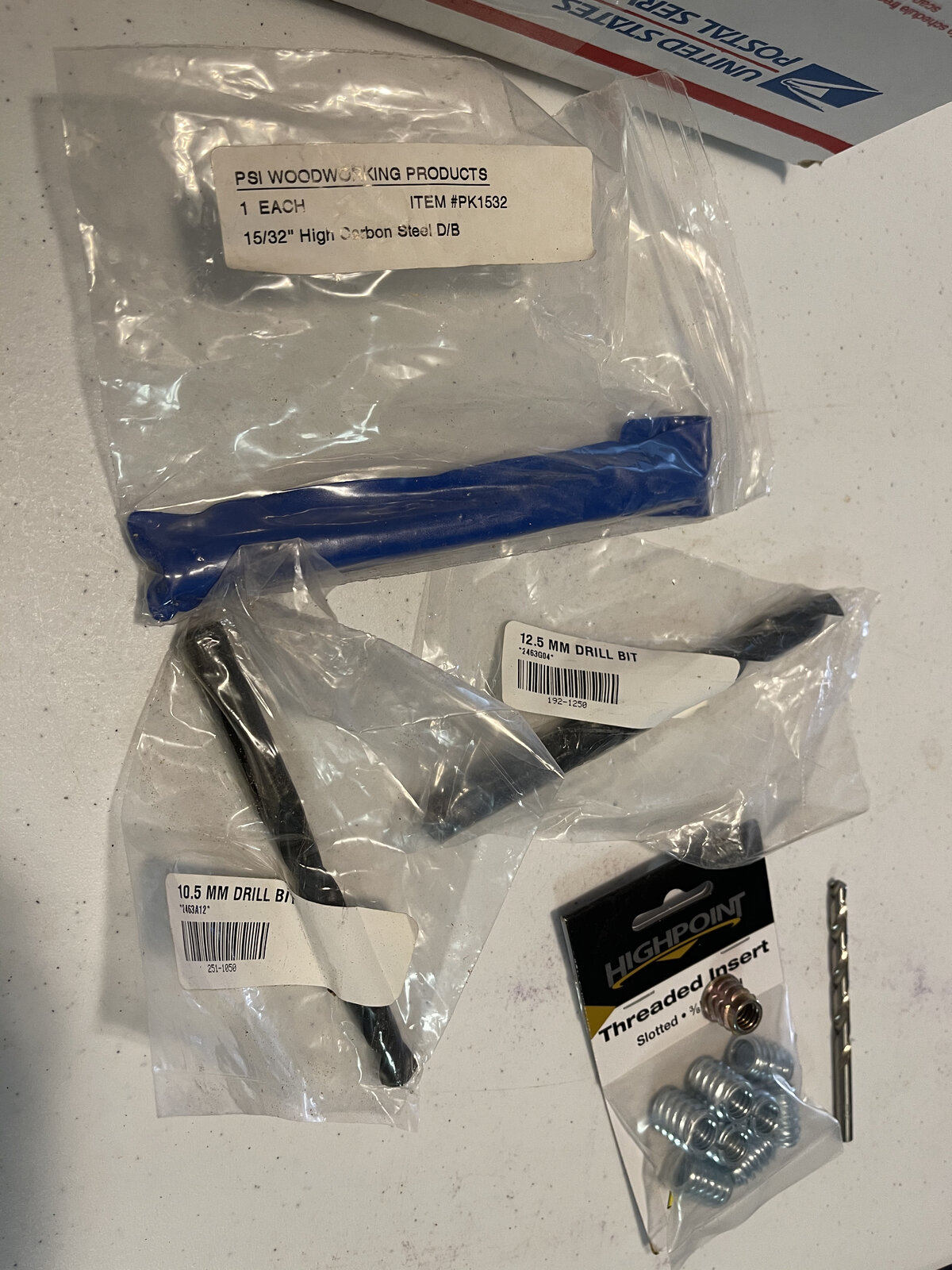 Box of assorted pen kits, projects and drill bits. Includes brushes for shaving, one razor kit, parts to make a cane, letter opener kits, ceiling fan pull kits, mini kaleidoscope kits with bushings and more. 1 unopened jar of pearlex colorant. What you see in the pictures is what you get. All shipped in USPS flat rate, CONUS, Paypal. $60.00.