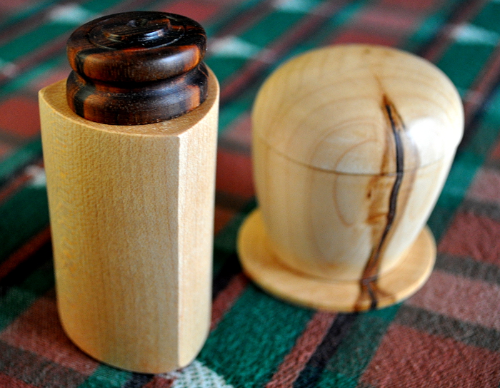 The box on the left was inspired by Robbie's most recent video on three-sided boxes (Robbiethewoodturner - YouTube). But unlike Robbie's project, I chose to make a round top from a scrap of contrasting wood (goncalo alves). The finish is teak oil.