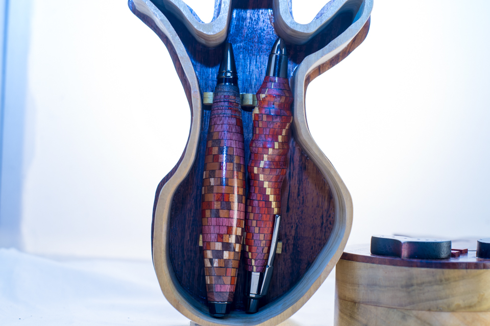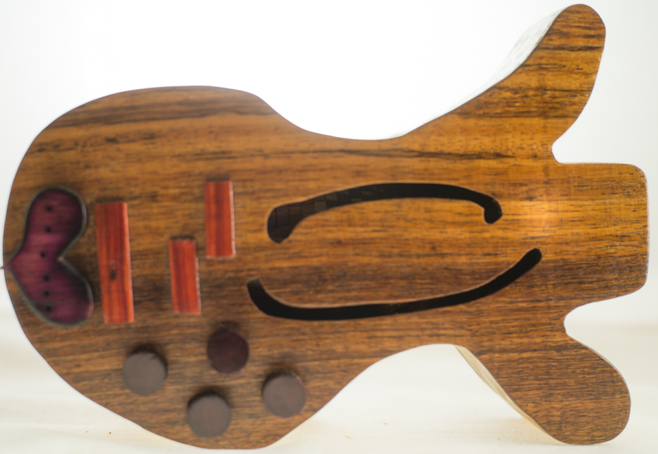 made this for my friend in Colo. the box is made of popular(sides), red heart(pick ups), purple heart(bridge and knobs), Koa(front, back) i hand drew this for him he is a musician and had lots of fun making music