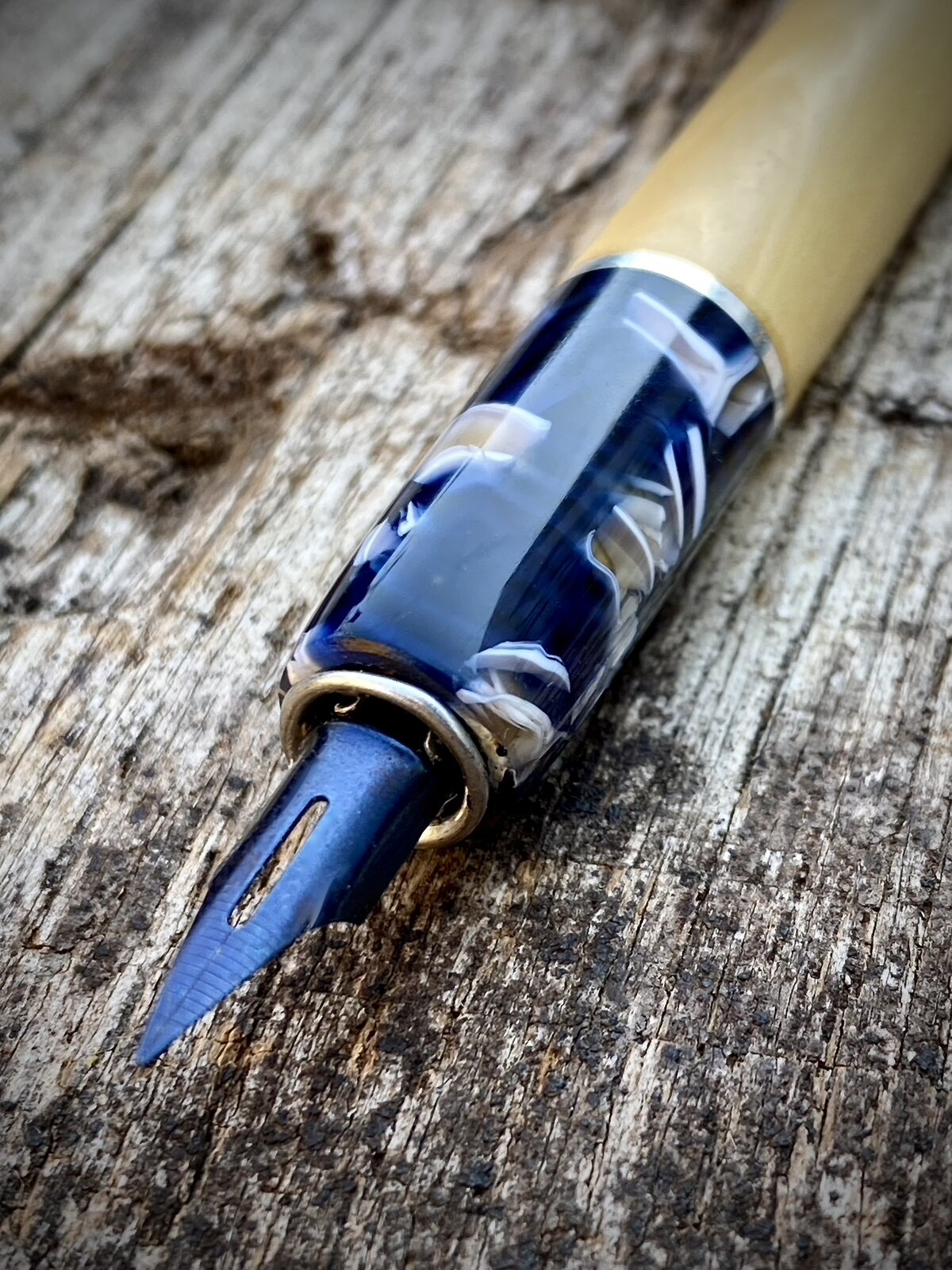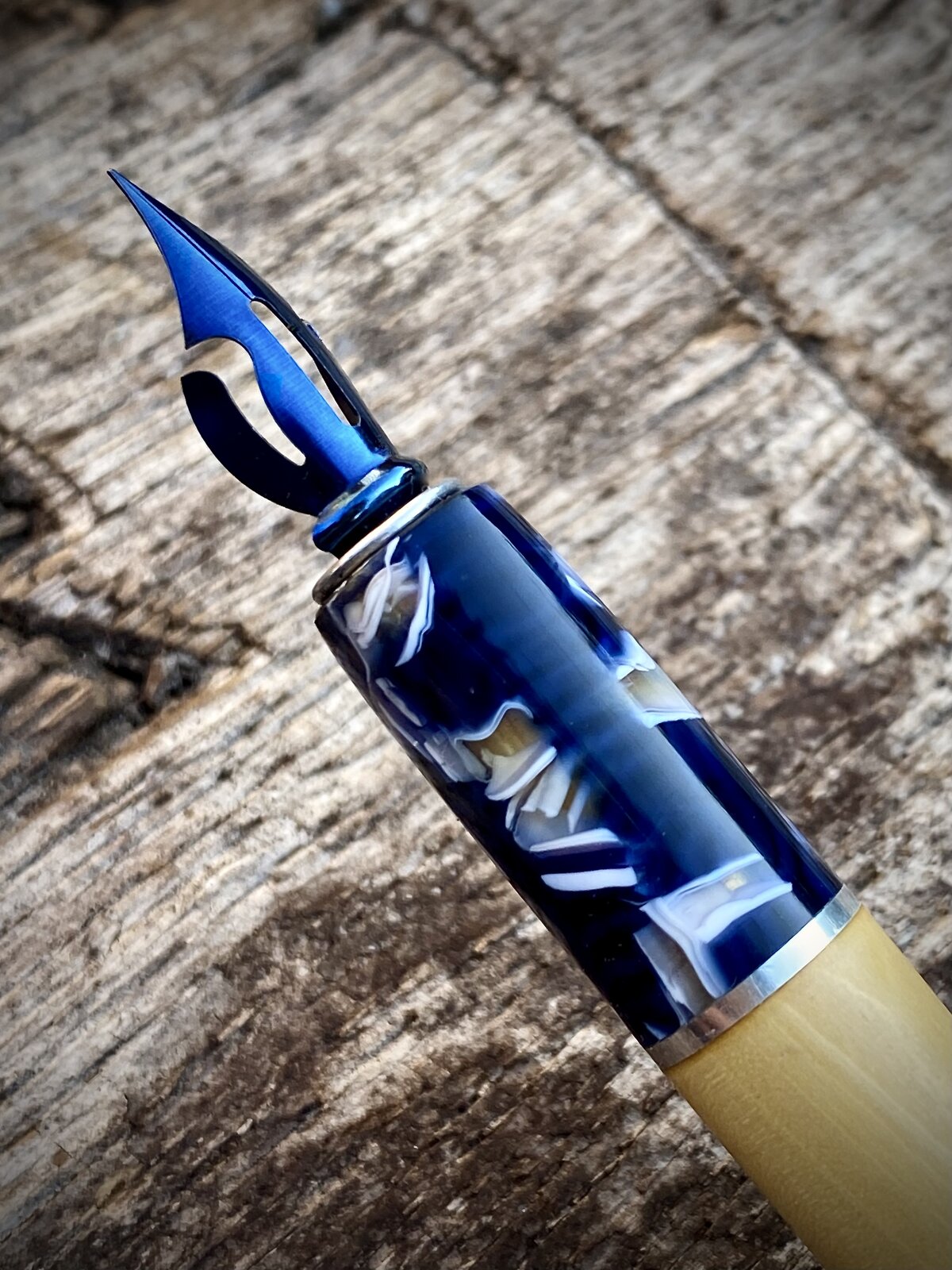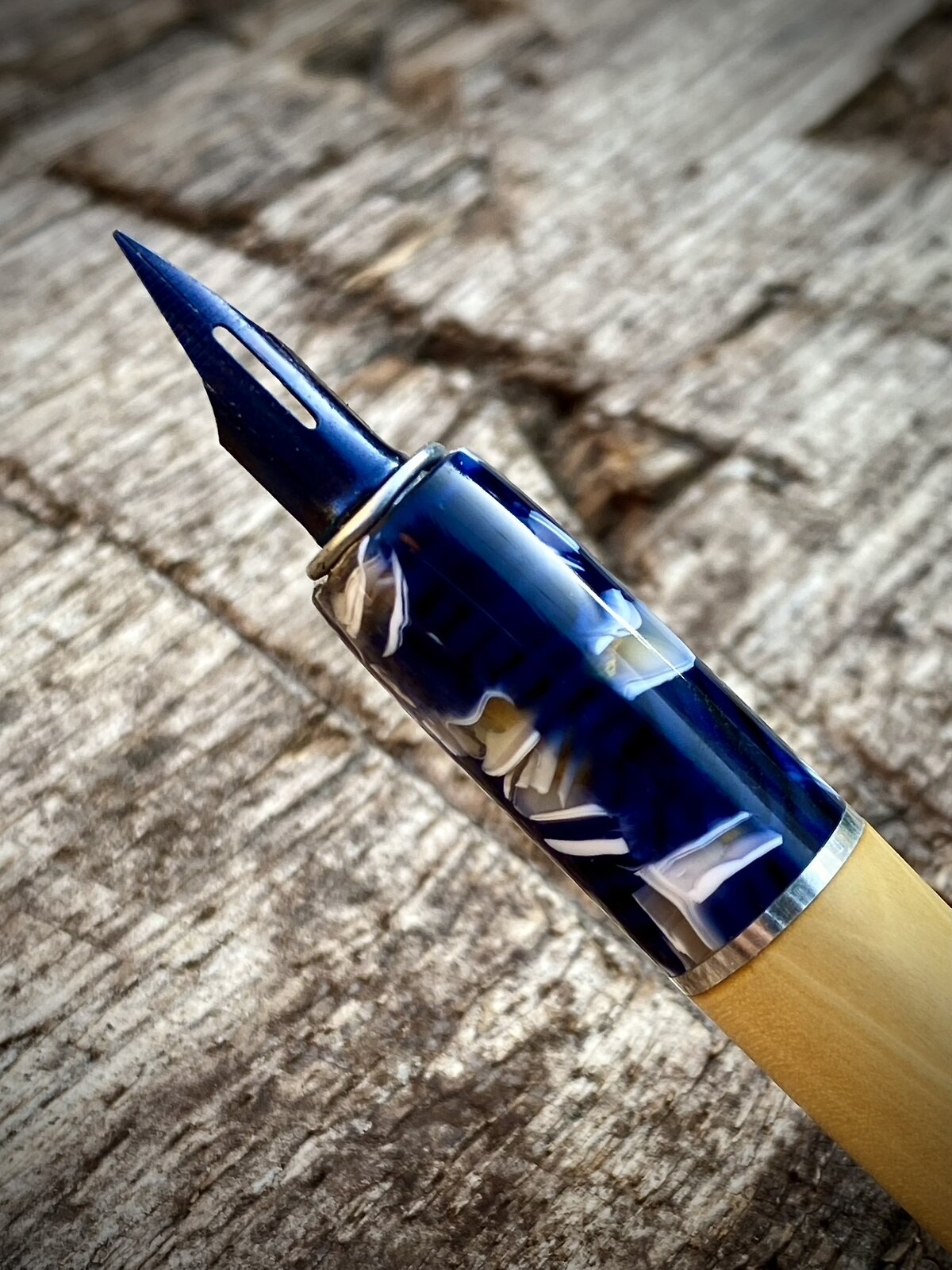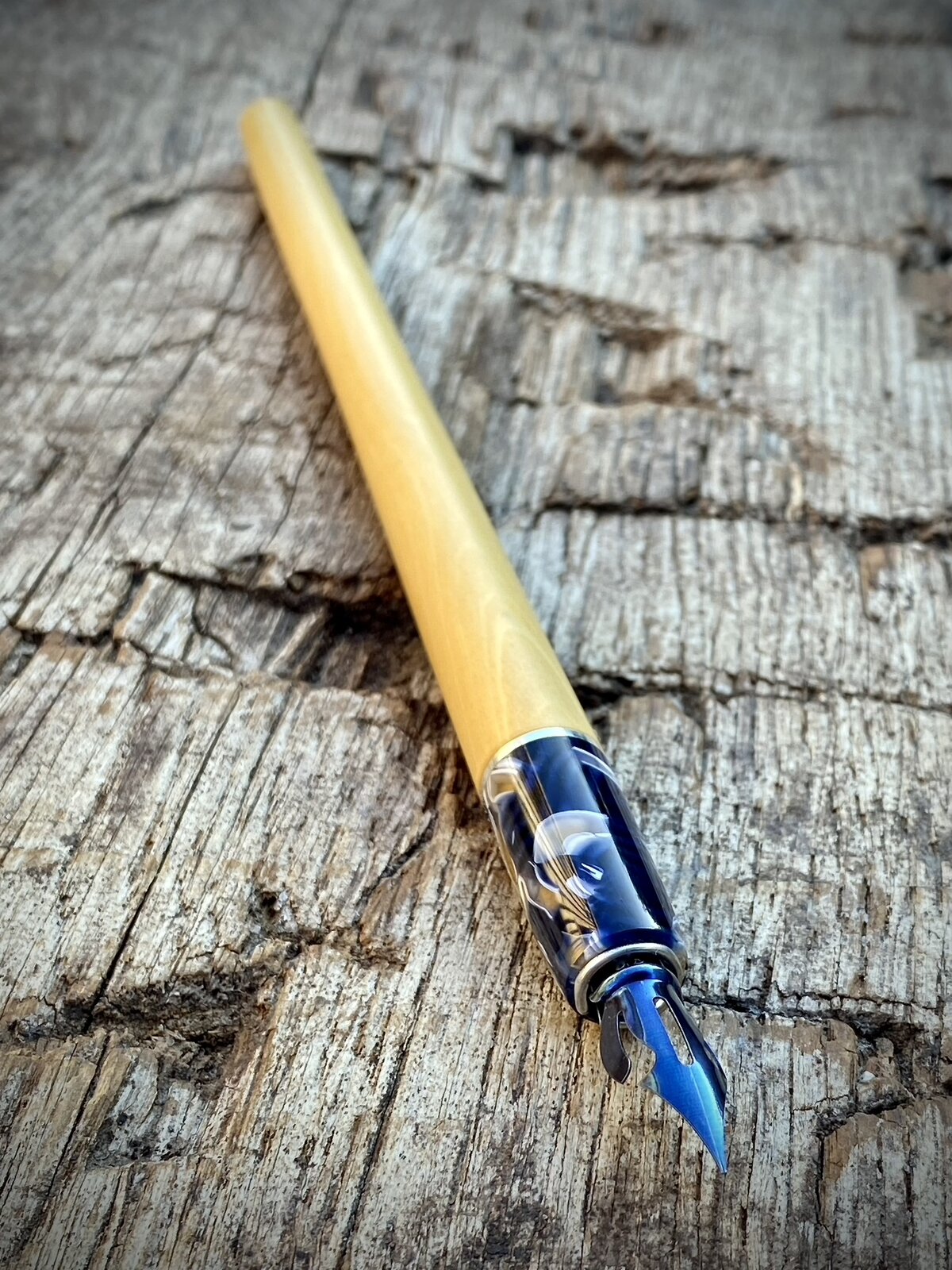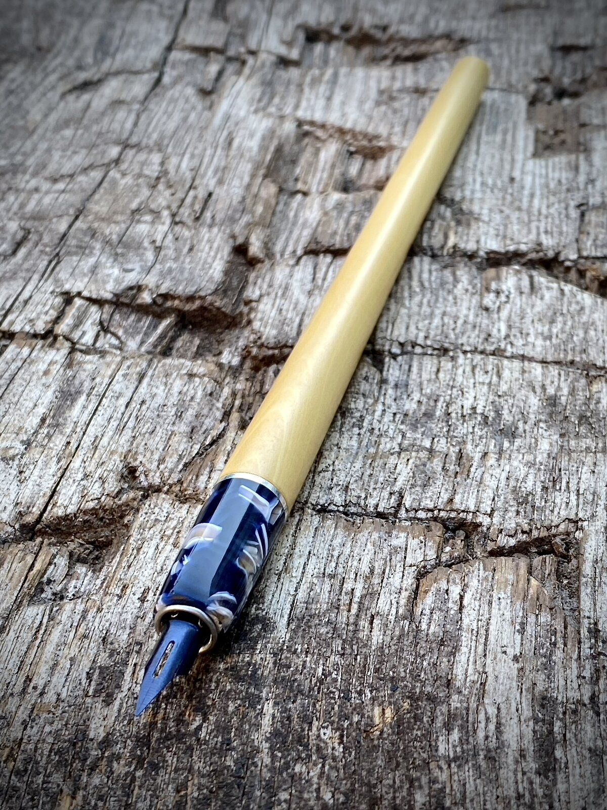 I've had some lovely boxwood for a while so thought I'd use it to make a dip pen/nib holder. I paired it with one of my favourite cellulose acetates and a sterling silver ring. I did this not just for aesthetic reasons but because I've made nib holders entirely from wood in the past and the nib end can get messy and difficult to clean if the wood comes into contact with the ink, which is somewhat inevitable when dipping the pen.