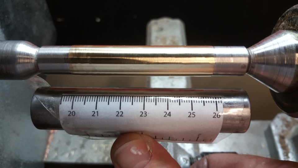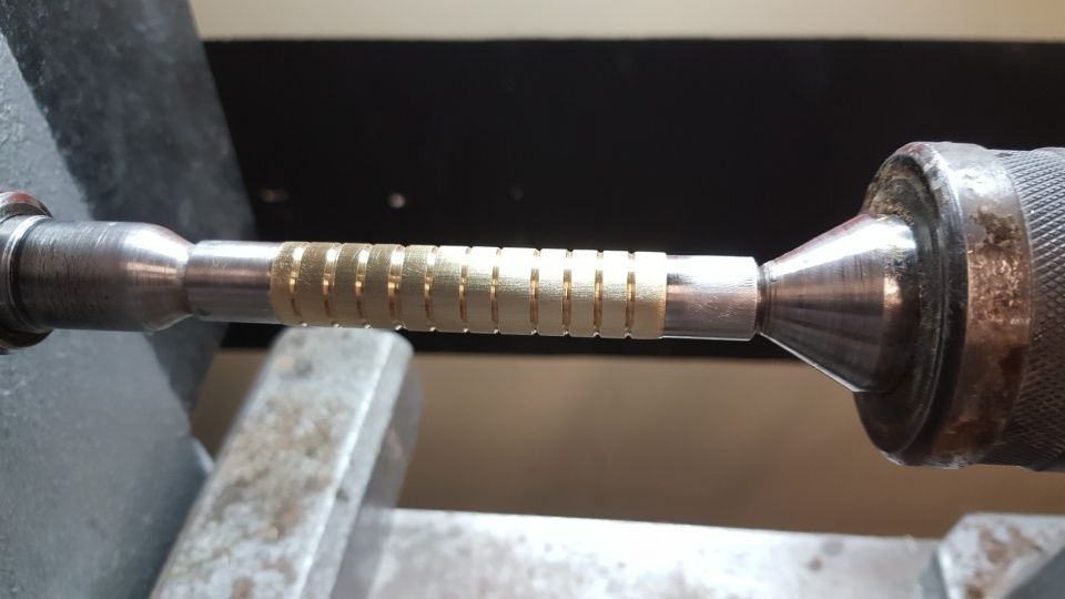The brass turned really well, and I wanted to do something different. Got it down to size and then sanded lengthwise with 220 grit Norton 3X to make an even texture. Then I wanted to cut bright lines in a nice pattern, so I printed a ruler (printable-ruler.net) and taped the metric side to my tool post. Used the corner of my carbide tool to cut into the brass at 5mm intervals. Again, I used a "design opportunity" to make a couple of lines a bit different (okay, so I messed up a couple of lines) and it looks good to me.
