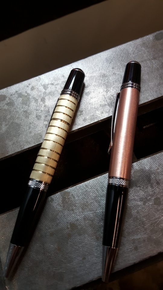 Wanted to show off a couple more metal pens. Using 1/2" stock for a Sierra means only about .026" of material has to be removed. These metals, and the aluminum were easy to barrel trim with a HHS trimmer, and they turned fine with HHS. I use carbide and that works well, too.
