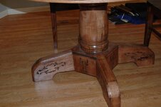 Made my first Breakfast table. All out of pecan. Cut my blocks and glued them onto birch plywood(the only thing that is not pecan). Covered edge of plywood with thin piece of pecan. Turned pedistal and made design in the legs with router. Stained to bring out the grain. I think pecan is a beautiful wood to work with, especially cause i did not pay anything for it.