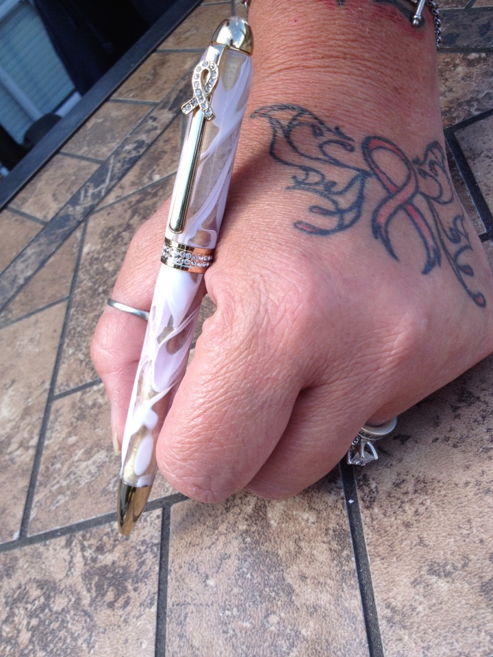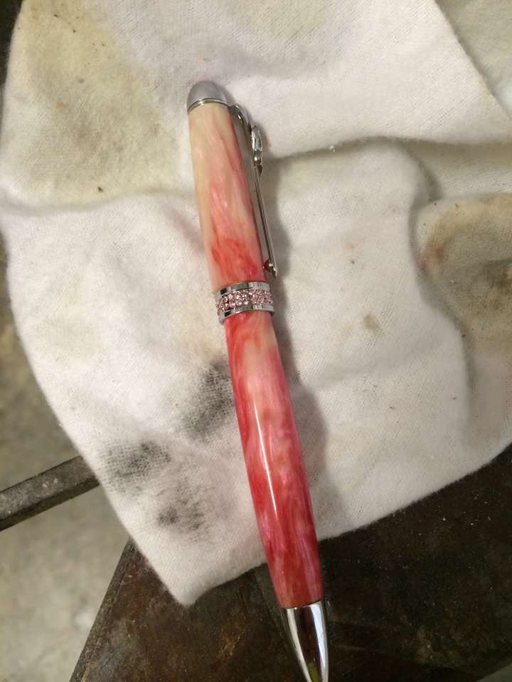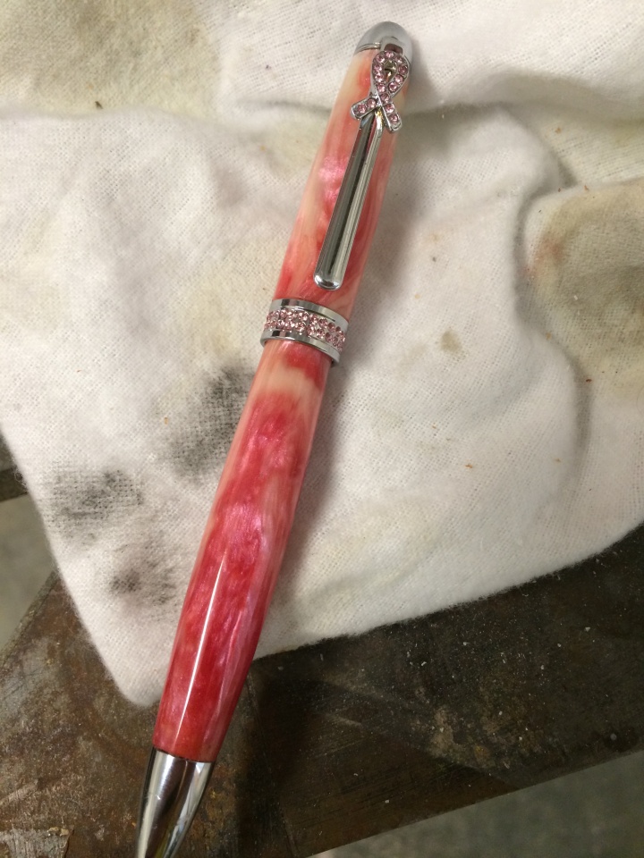 I have one of these currently on order ... a chrome with pink crystals. It will NOT be done in a pink blank, however .... The chosen color for this customer is the Aquarious blank (a gorgeous blue with some green tinting here and there). He is a survivor of prostate cancer, and wants to have this pen for himself.