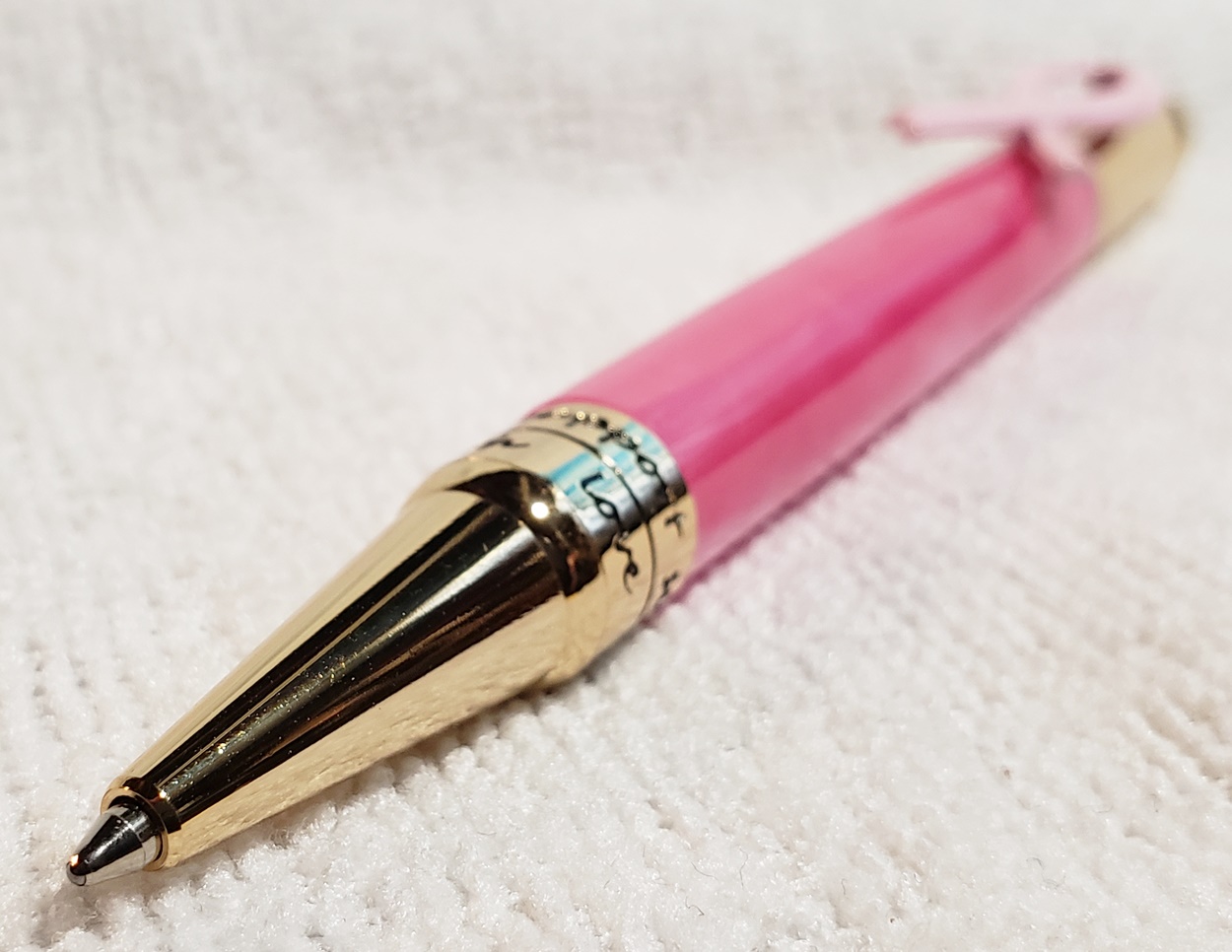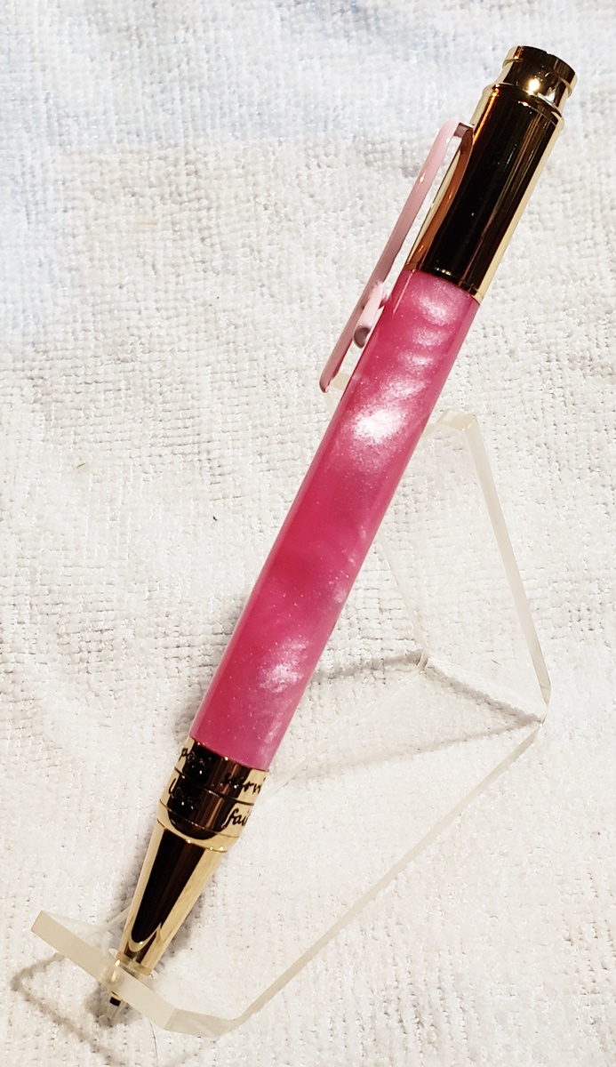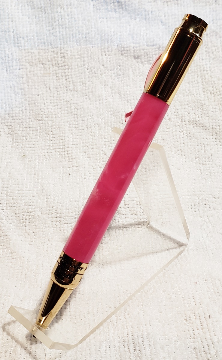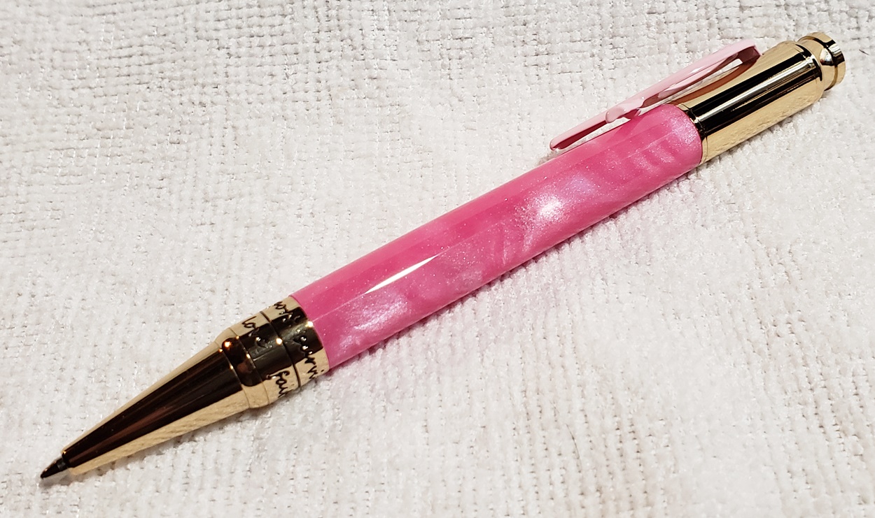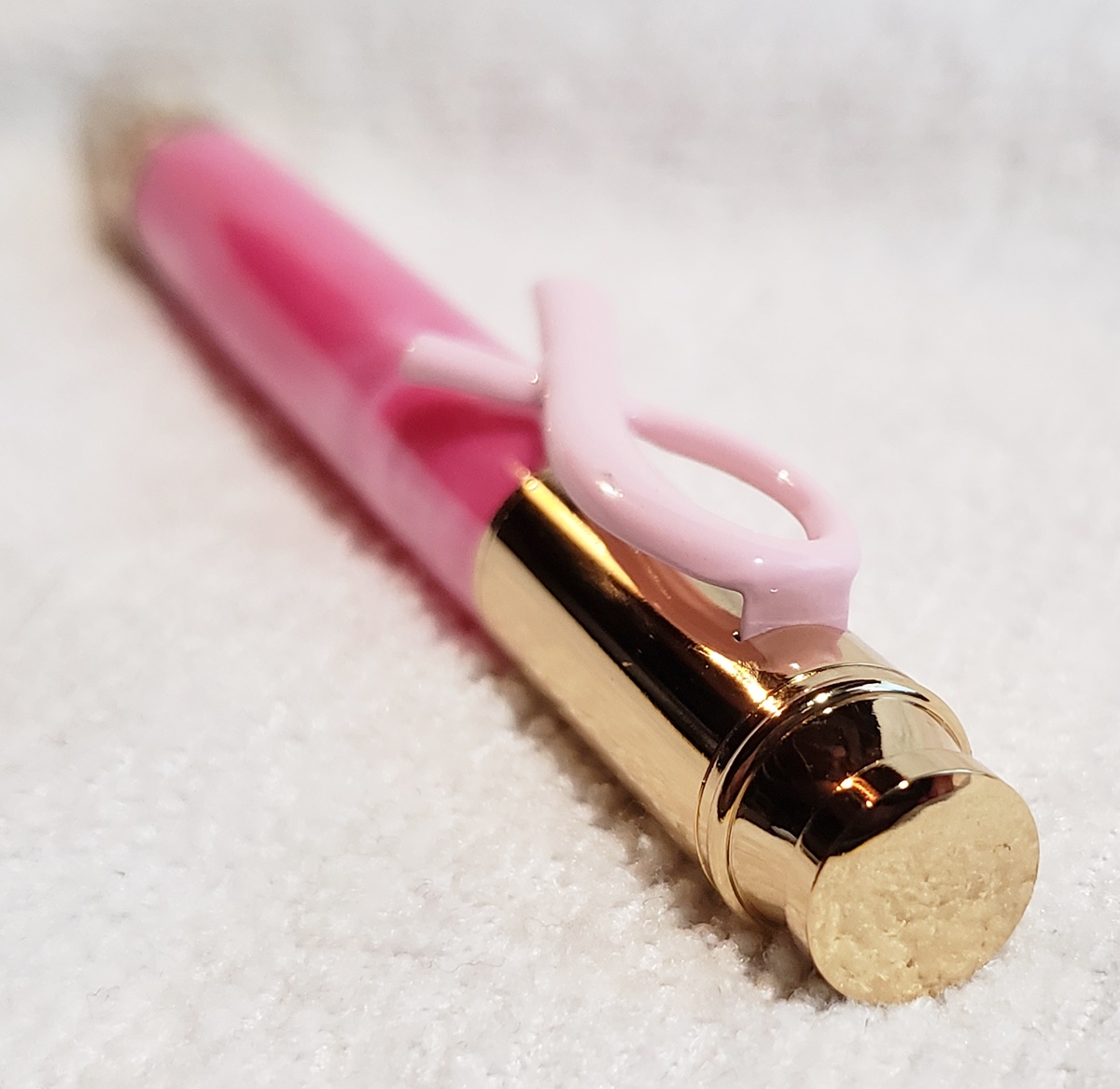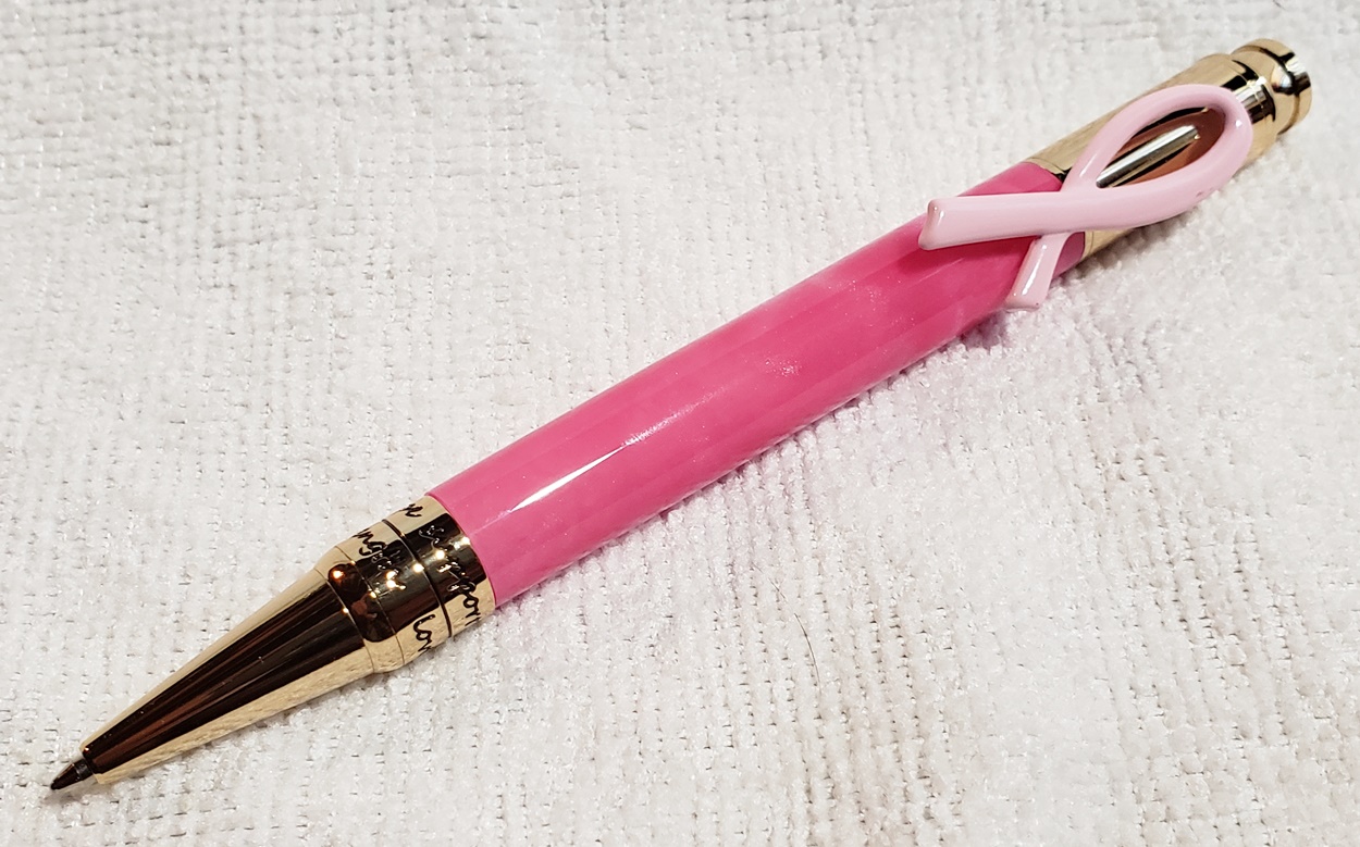 This the redo of the cracked blank. I actually like this one better. The pen is a Breast Cancer pen in gold from Woodturningz. The blank is an AA called Pink Passion, also from Woodturningz. Very happy with it.