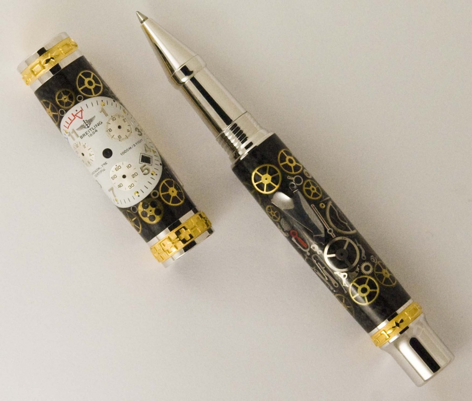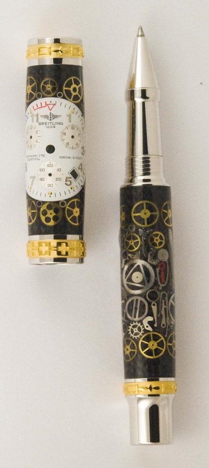 I usually donate these larger watch part pens with Gary's blanks to gala's or benefits for kids. In this case, I made this for a man I recently met. He is a pilot, a veteran who served in Vietnam. I had the opportunity to spend a few hours with him. I listened as in a soft tone he relayed to me the events in his life that led up to him sitting in a chair near me. I knew that he did not feel well but he patiently answered the questions I asked. As I listened, I heard a story of four decades of quiet suffering following his service, a story of physicians who had failed to render proper care and a system that had failed him. It affected both he as well as his family. I offered to help and he accepted. This pen is a small token of my admiration and appreciation of his service.