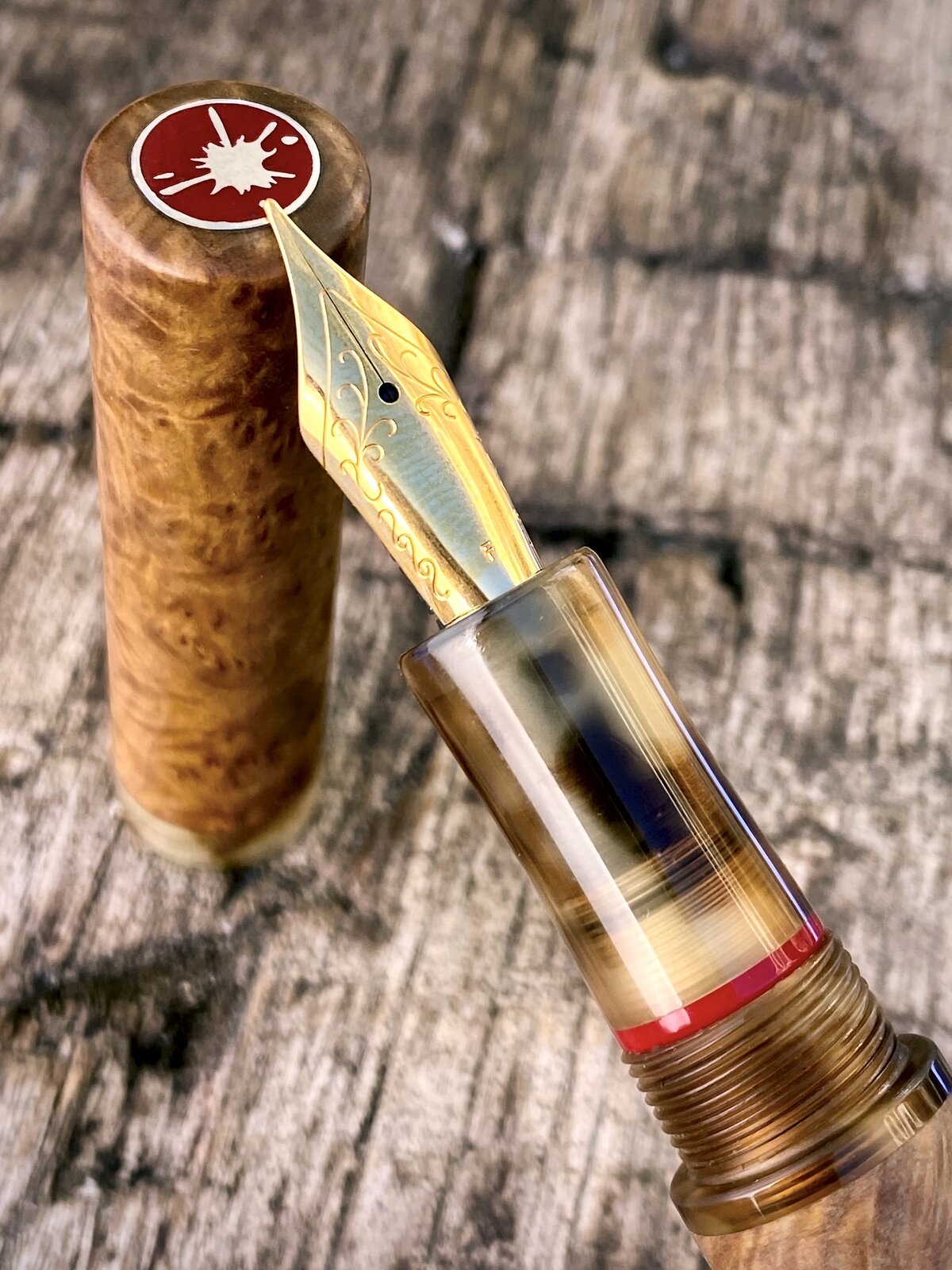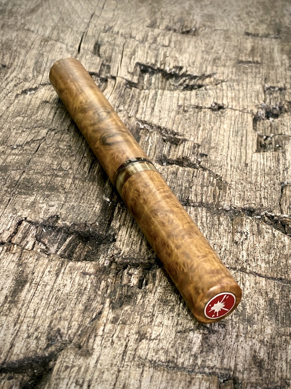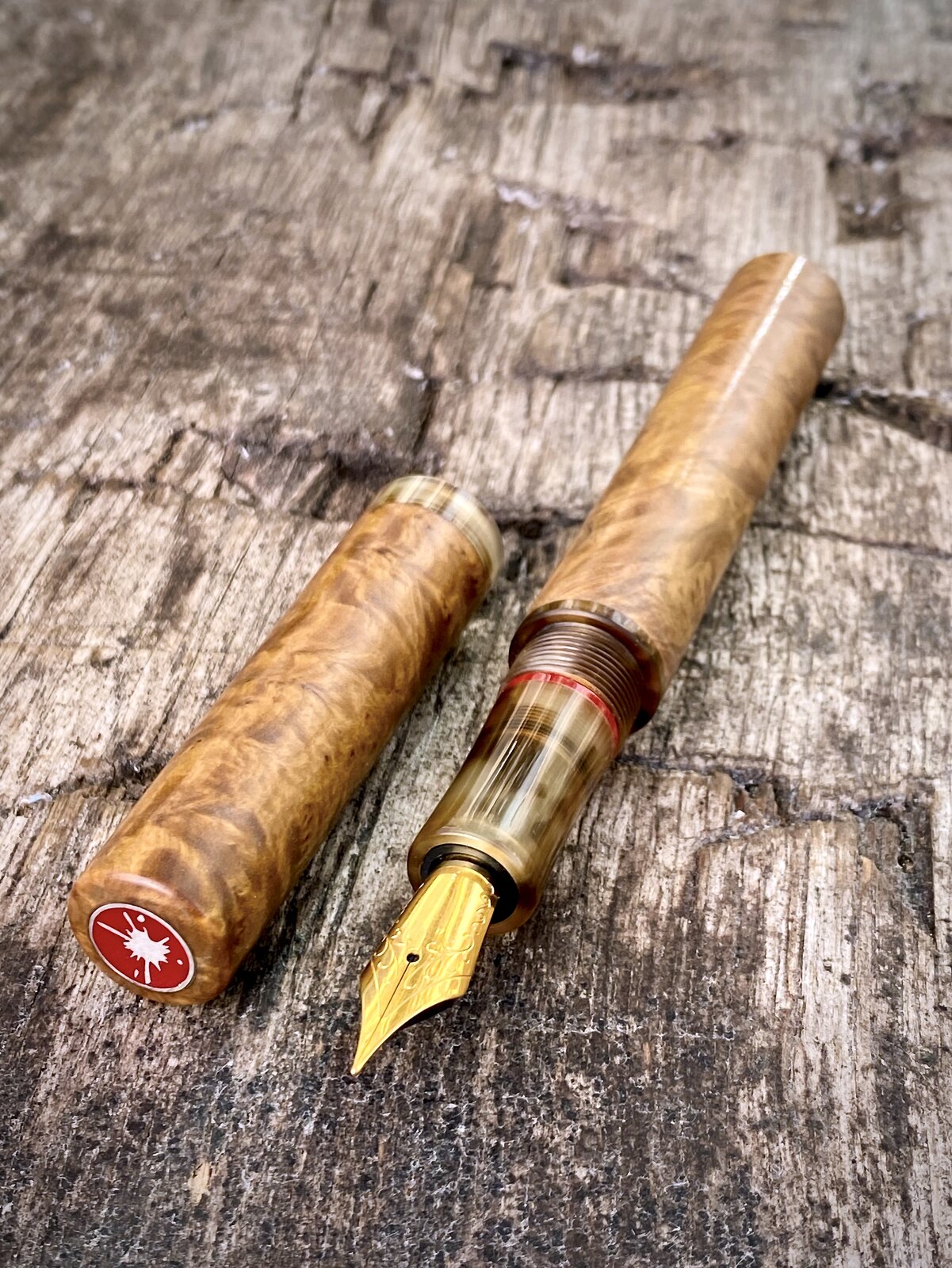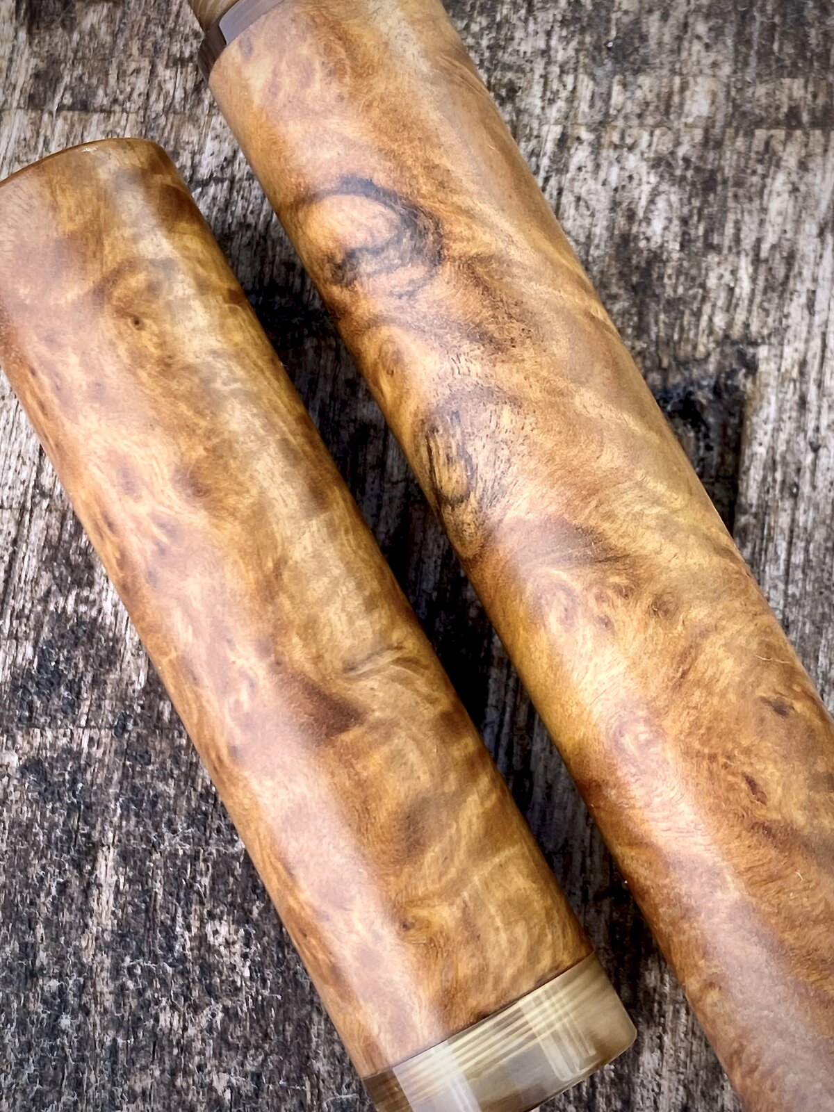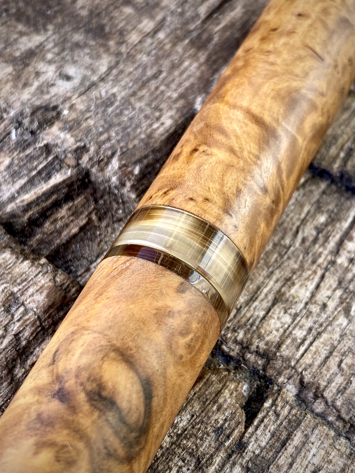 This is made from Brown Mallee and cellulose. I used a lighter tortoiseshell colour for this one to try to blend it with the wood. The brown mallee, (the name for the burr from certain eucalyptus trees, rather than a species in its own right), is stabilised.