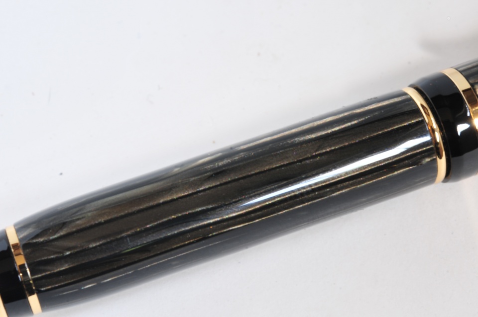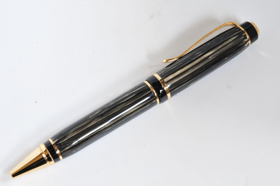 Has some gold striping in the brown material. You have to really move the pen around in the light to see the beauty in the material. On a gold cigar kit.