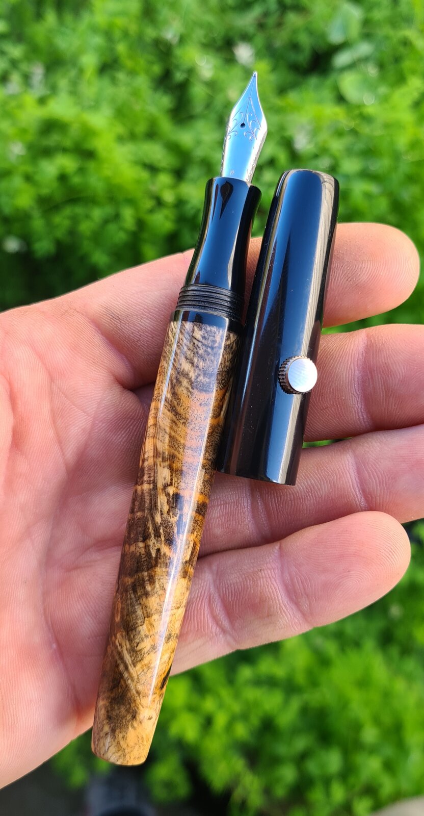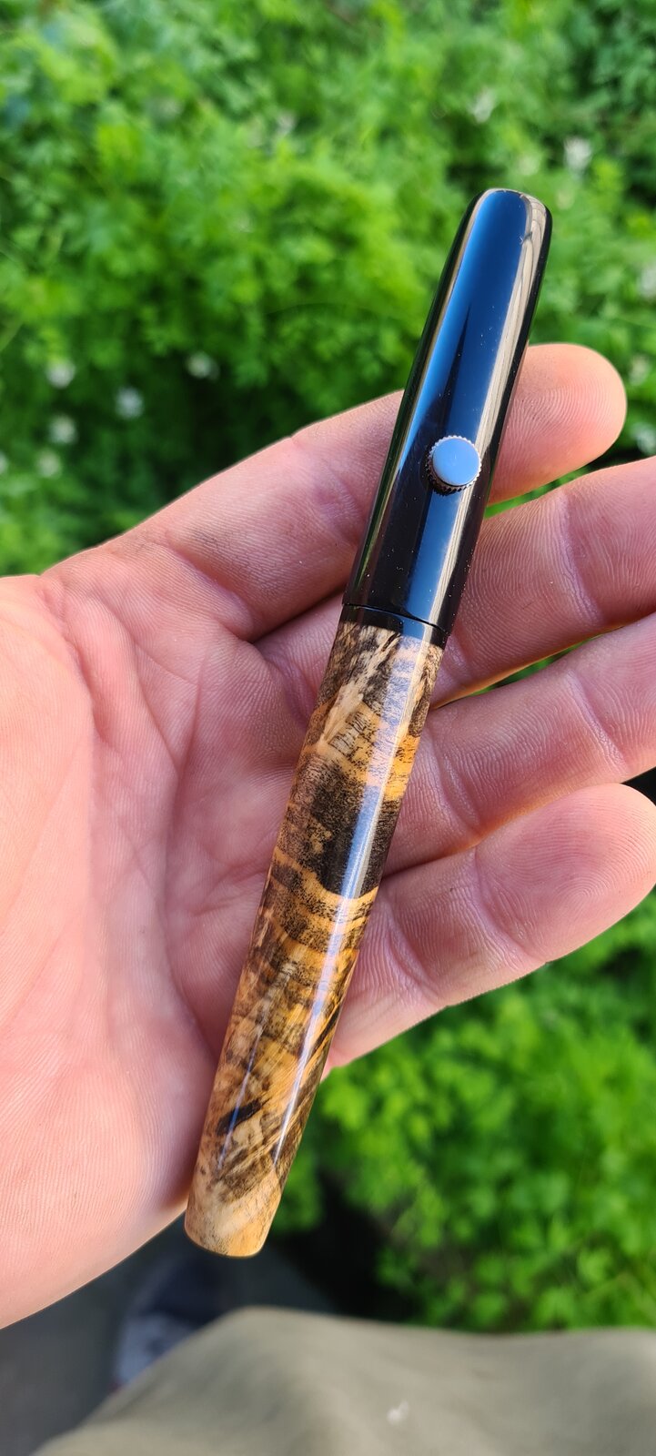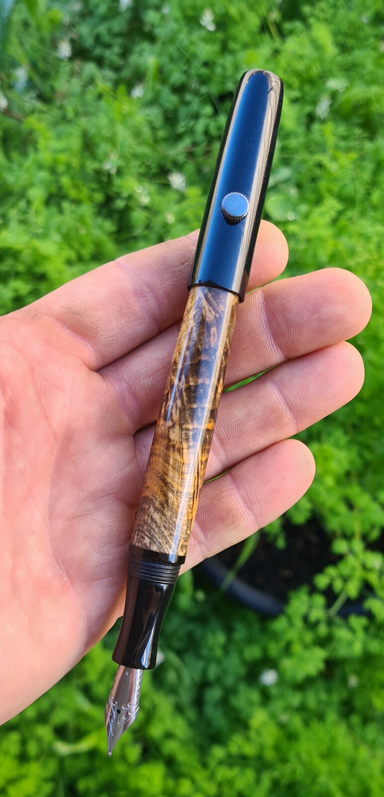 This killer piece of stabilised buckeye burl was too short for a full kitless, so used some black acrylic for the cap and section. I sleeved the barrel with ebonite. The acrylic threads on ebonite threads feel fantastic!