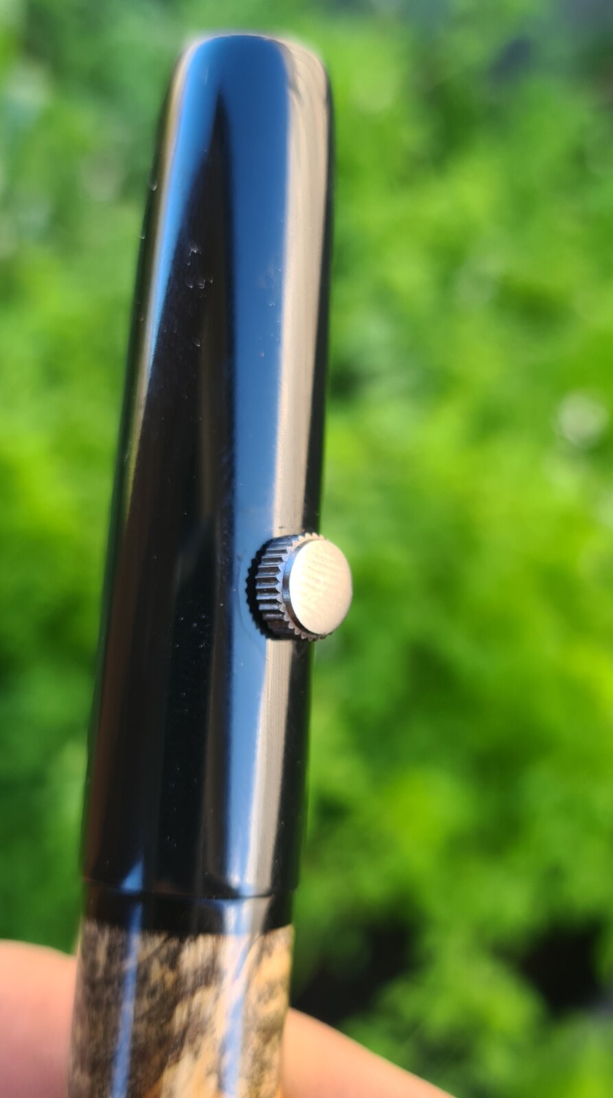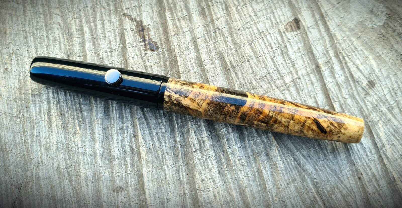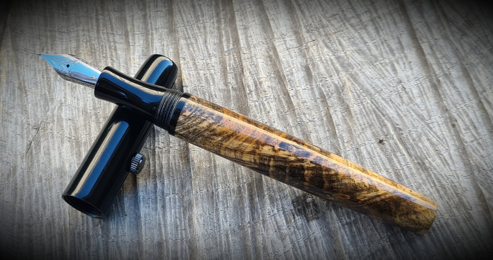 This killer piece of stabilised buckeye burl was too short for a full kitless, so used some black acrylic for the cap and section. I sleeved the barrel with ebonite. The acrylic threads on ebonite threads feel fantastic!
