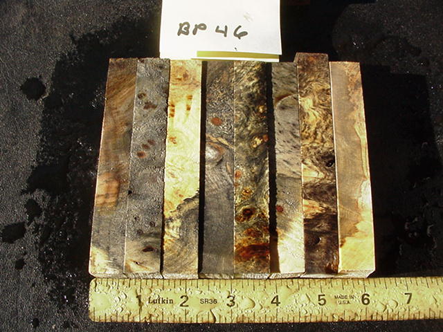 BP46, eight blanks measuring 3/4 x 3/4 x 5" long. $20.00, I'll pay shipping. I lowered the price on this set, it didn't come from the same large slab as my previous lots that had lots of eyes/color...these still have the color buckeye is famous for but not as much figure.