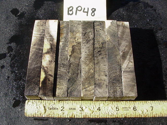 BP48, eight blanks measuring 3/4 x 3/4 x 5" long. $20.00, I'll pay shipping. I lowered the price on this set, it didn't come from the same large slab as my previous lots that had lots of eyes/color...these still have the color buckeye is famous for but not as much figure.