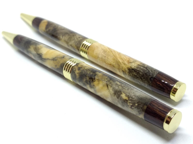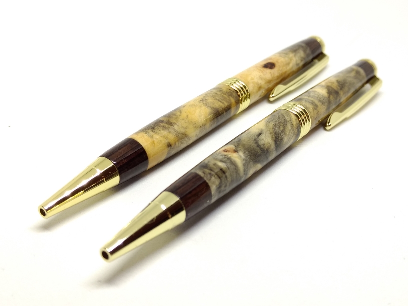 It's been ahwile since I shared some photos of some pens, so I figured I would share these. I had an order placed from a lady I met at a craft fair earlier this year who liked the buckeye burl but didn't like the bigger profile. She liked the trimline pen hardware instead, and although that kit is lower on the list of ones I would use my nice buckeye burl blanks on I didn't complain since I charge based on my raw material costs anyways. Plus, it turns out, I think they look quite nice!