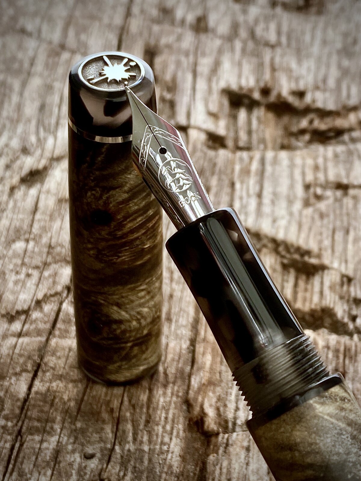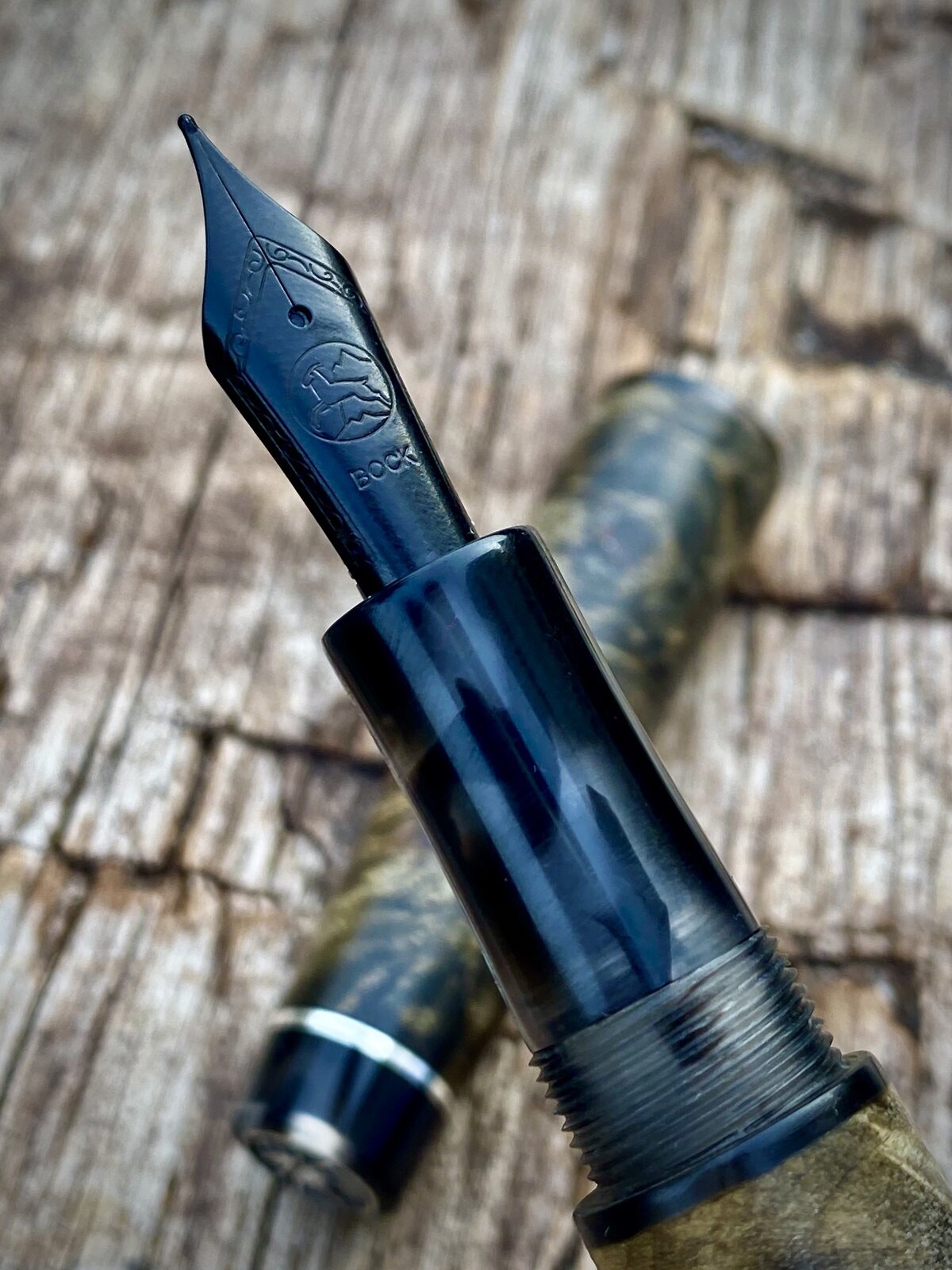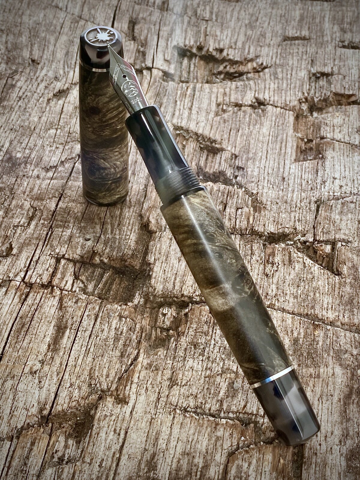 Made this pen yesterday. The wood is dyed and stabilised buckeye burr from a batch of different coloured blanks I bought off a guy on Facebook. The threads and finials are cellulose acetate and the accent rings & logo coin are all sterling silver. Fitted with a Bock nib.