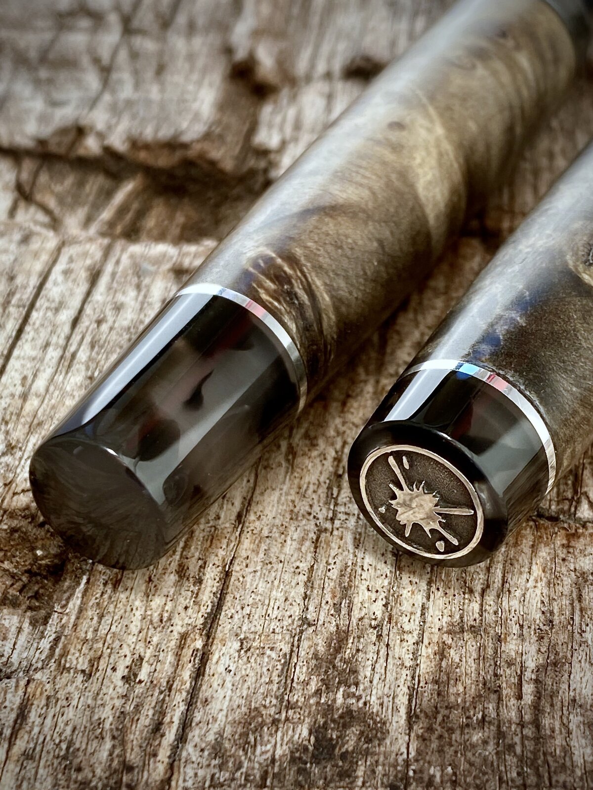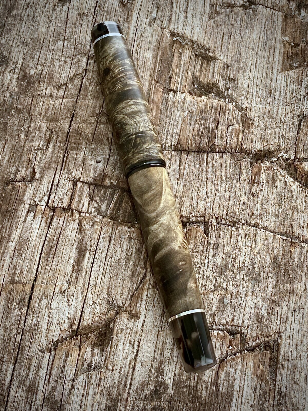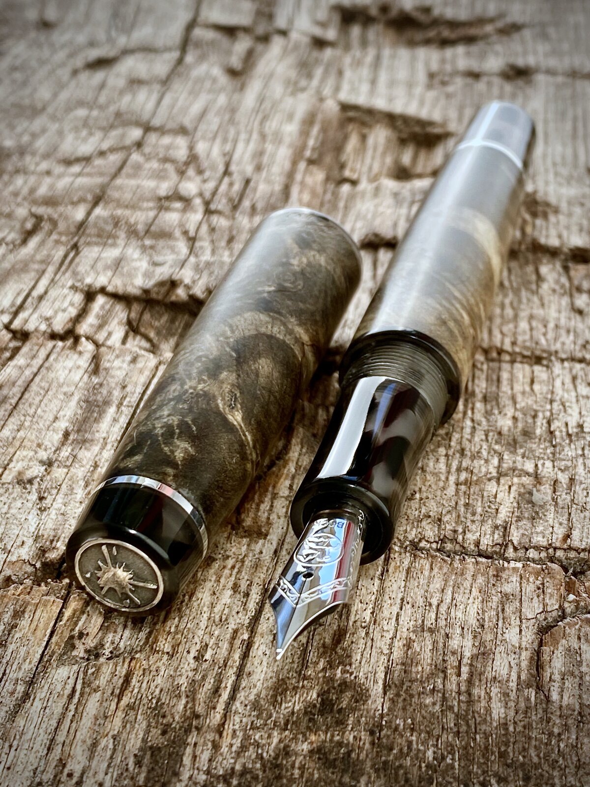 Made this pen yesterday. The wood is dyed and stabilised buckeye burr from a batch of different coloured blanks I bought off a guy on Facebook. The threads and finials are cellulose acetate and the accent rings & logo coin are all sterling silver. Fitted with a Bock nib.