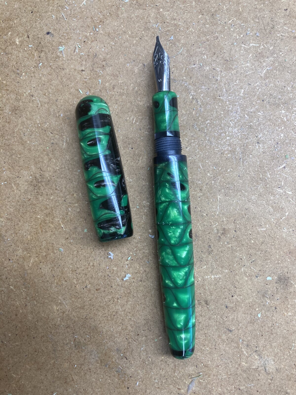 Stabilized Buckeye Burl lined with ebonite, Buffalo section also lined with ebonite. M13 Triple start and a JOWO #6 Nib.