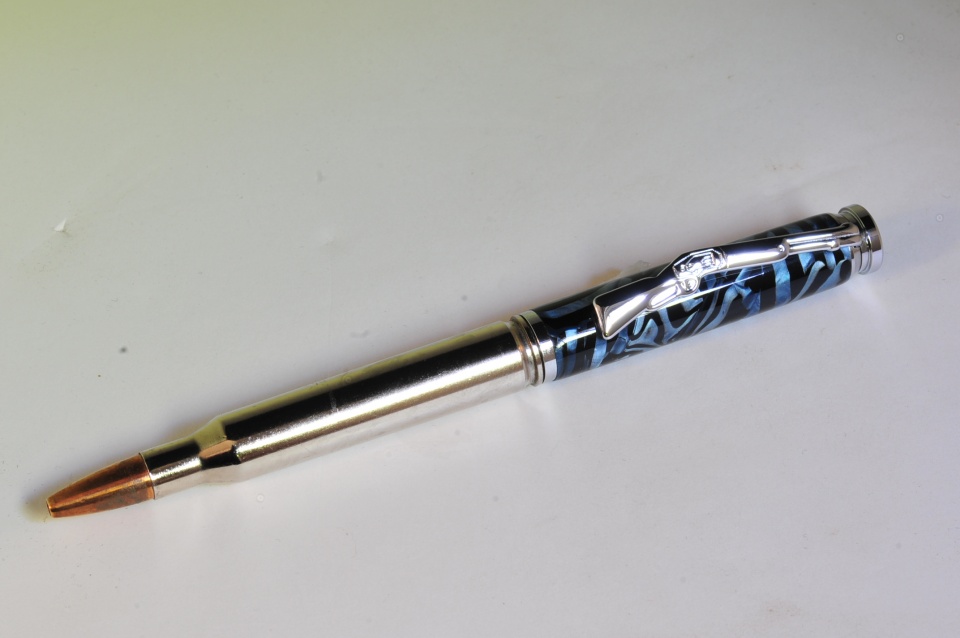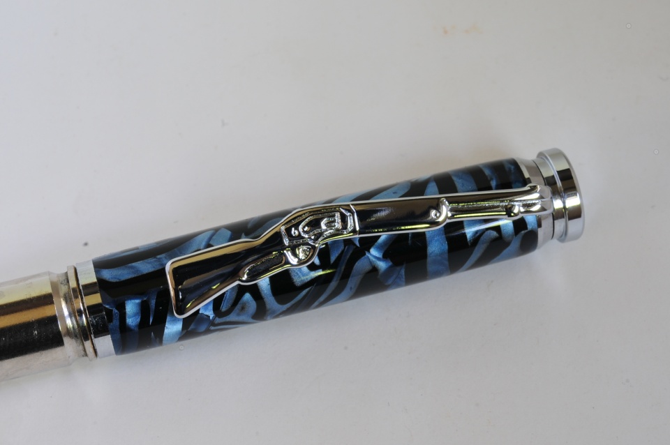 Here is a 308 MAG bullet pen kit with some vintage Cellulose Acetate with a crazy pattern I call Zig Zag in blue and black.