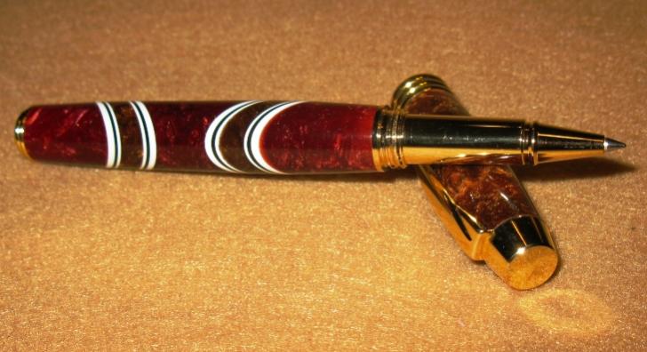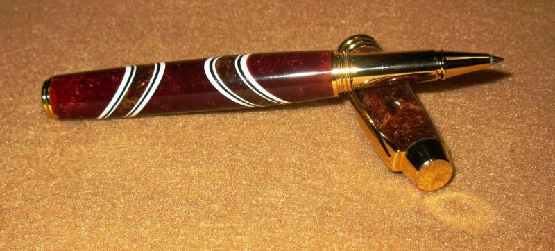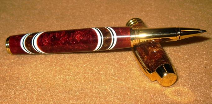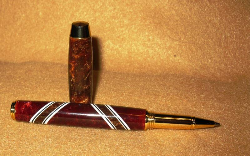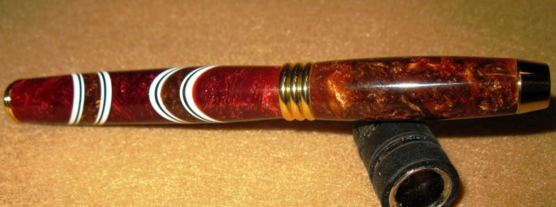 I used two Blanks from Exotic Blanks for this one, Burgundy wine and Bronze. The Burgundy Lower half is segmented with pieces from the Bronze and W/B/W pick guard, the upper half is just Bronze.