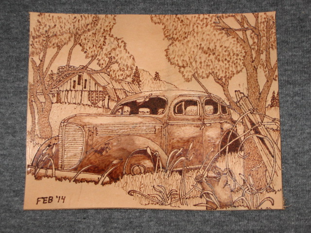This is the first attempt at pyrography since I was a kid. Trying to see if I can do anything worthwhile enough to integrate into pen and bowl turning. Got about 5 hrs. into this little picture. It's on leather and approx. 6 1/4" x 5". Comments and critiques, especially from experienced pyrographers, welcomed.