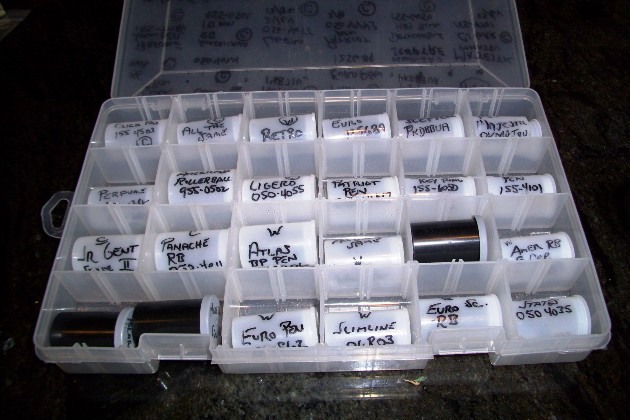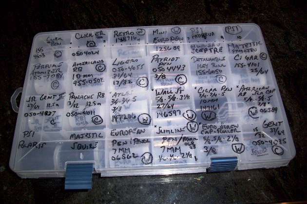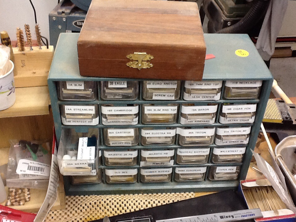 I got this idea from someone else. I put each set of different bushings in a Prescription Medication bottle (tube) after I am done with that prescription. I take the label from the baggie the bushing set comes in and put it on the medication tube (btw -cleaned out thoroughly before being re-purposed). I have a cabinet (similar to the Akro Mills cabinet shown earlier in this thread) with a lot of small drawers. Each drawer has one style of pen on it-accordingly labeled. I keep the bushing tube for that pen style and any extra brass tubes for it and possibly a drill bit for that size as well if it's an odd one 27/64 being an example. It works well for me.