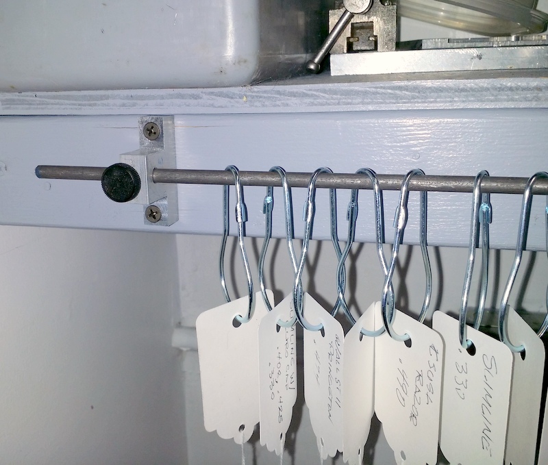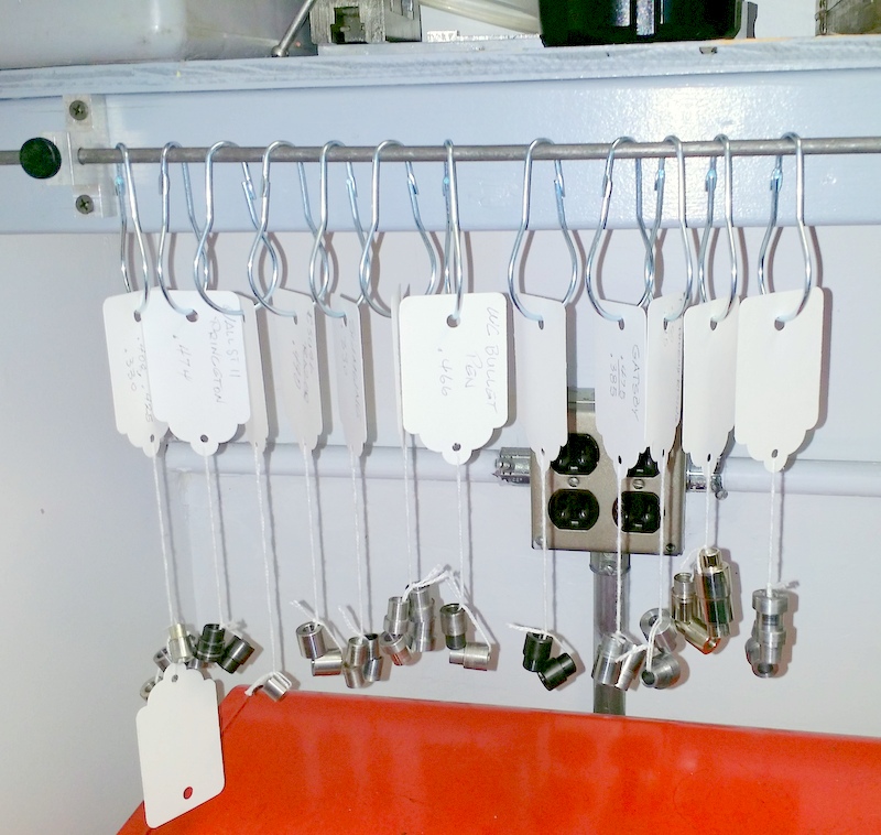 Bushing storage, I've tried them all. Plastic compartment boxes, plastic drawers, small baggies on a pegboard, small insulin strip containers, etc. I switched to Don Ward's system of shower hooks. I made some brackets to hold a 30" x 1/4" rod. Nice and neat and does not take up bench or shelf space. Thanks Don.