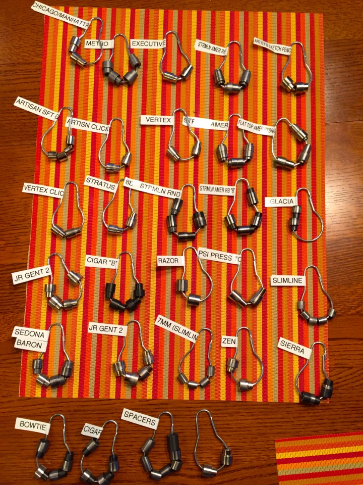 When you start using the TBC bushings you'll find that you won't be able to use the shower curtain holders as TBC bushings do not have the hole through them for a mandrel. I purchased a lazy susan spice rack at Goodwill for a couple of bucks. It holds 20 sets of bushings and fits in about 9x9 inches on my bench. I simply labeled that cap on each spice bottle so they are easy to find. Just one more method to solve this problem.