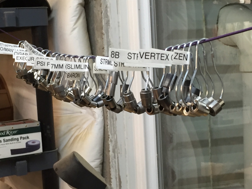 I have plastic shoe boxes, one for each style of pen, inside the box are the bushings, the kits and the drill bit or bits. If I want to make a certain pen, I grab that box and I have everything I need except for the blank, glue and finish. If I have special blanks for a certain kit, those blanks are in the box. A 4x6 card in the end of the box has all of the info I need to choose the box.