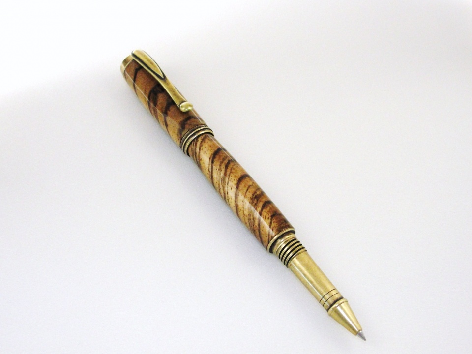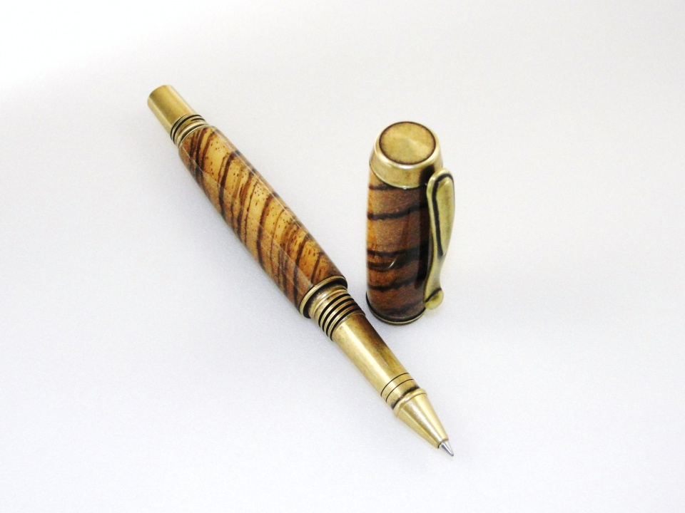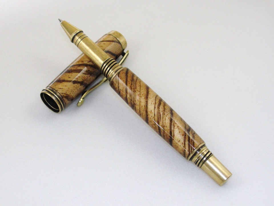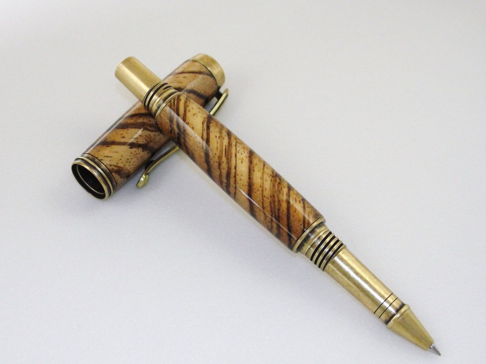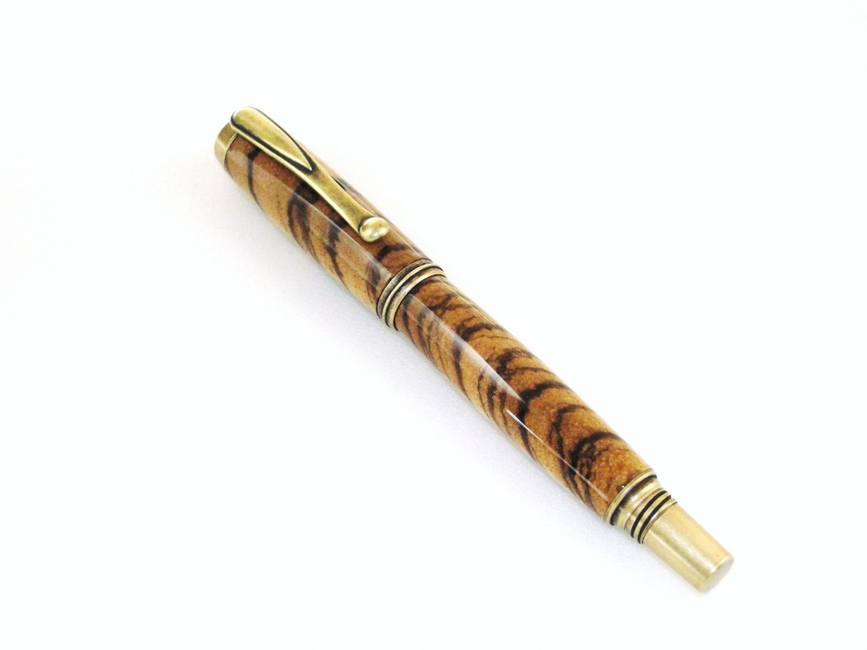 I had other titles but this one was the least corny. Jr. George from Signature Pen Supply - antique brass - encased in Zebrawood. This is a long pen when capped. Lower tube is a smidge longer to but it fits my paw rather comfortably. The zebrawood was a little on the flakey side but managed it. Ever stand there wondering what blank to use and no matter what you pick you get the feeling it's the wrong one? This actually matched so the anxiety is over. Had to build out the CA a little after an argument with the cap (I won). Polished with a little Ren-wax. Zebra is a challenge but I like it. This plating is a nice diversion from the Jr Gents and I will do a couple more soon. Enjoy... Happy Mothers Day.....