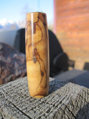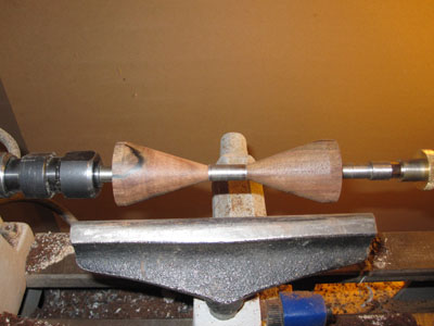 When I posted a pic of my first CA finish pen I had several questions including how to keep the bushings from sticking to the barrel. I am really glad I found this site! I got a ton of great advice but it got me thinking. I promised to update the forum if my idea worked well and boy did it! No stickiness between the barrel and my jigs at all! So here is what I did, I turned two matching conical pieces of hardwood on the mandrel down to the 7mm brass tube in the center of them. By having a rather shallow angle I am able to fit any size tube and the jigs do not make contact with the barrel ends. Here are some pics makes a ton more sence than this dyslexic can type out.