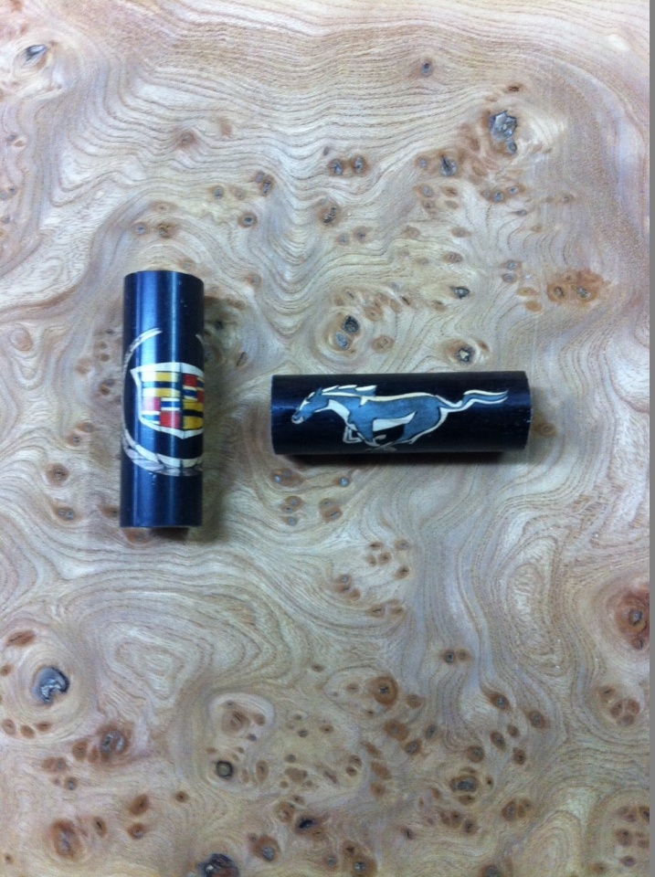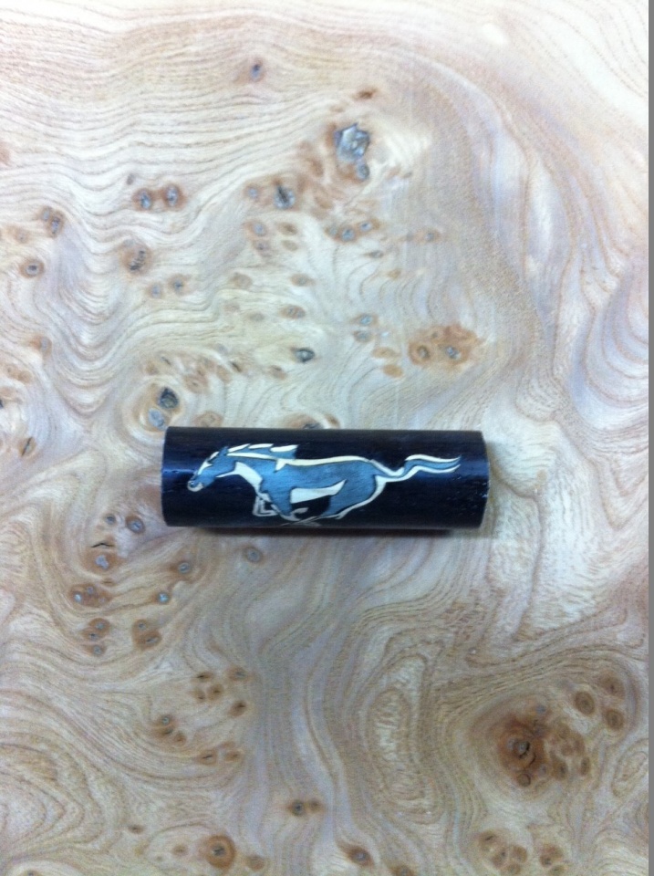 A guy ask me some pen blanks with the logos of cadillac and mustang they turn out nice and I thought I should share.The cadillac logo its made with over 50 pieces of wood and the mustang logo with almost 20 pieces of wood.I used dyed veneers and for the background palissandre.The blanks are not finished