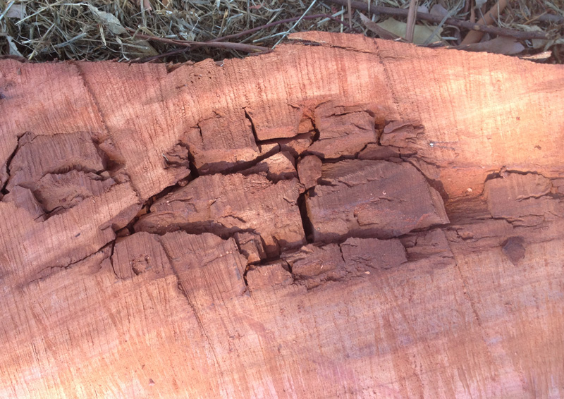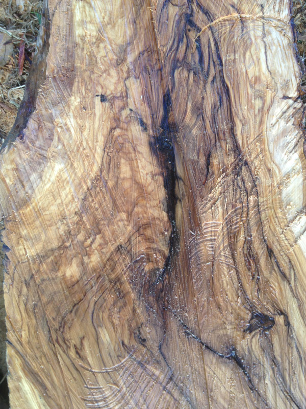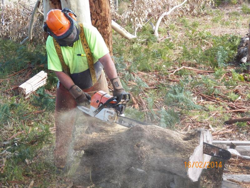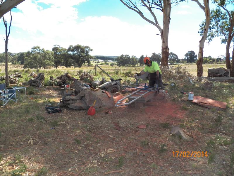Today we rigged up my mill and headed for his paddock of wonders :biggrin:. Started on what George describes as Fiddle Gum, a brownish gum tree timber with heaps of fiddleback (although you can't see too well in the photos), about 2' diameter and 6' long. I slabbed it into 4" slabs that George will cut up smaller on his bandsaw.