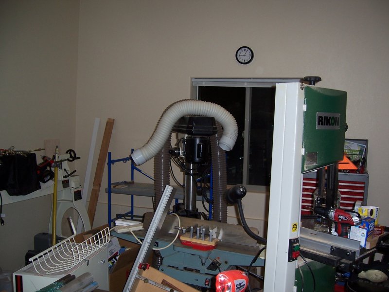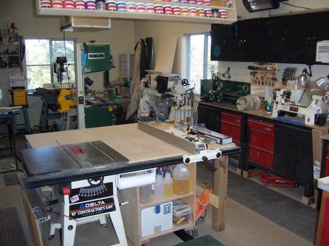 Thhis shows the little out-table I attached to my table saw and the semi-organized clutter in the background. The Jet ceiling mounted air filter is working so at least the air is pretty clean when I saw.