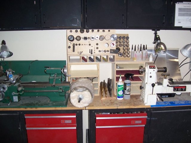My two small lathes set up with SOME of the attachments starting to take place. I still have days and days to unpack the clutter from where I just tossed everything in boxes and drawers when we moved.