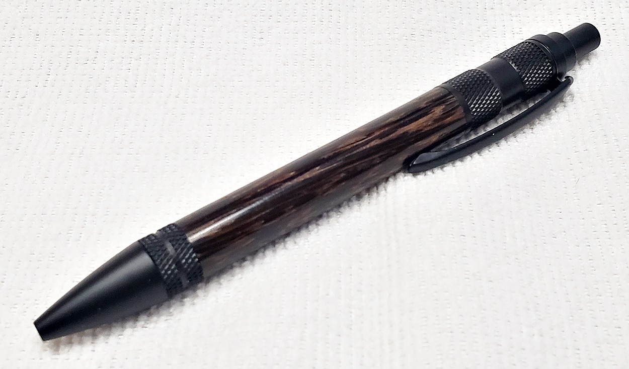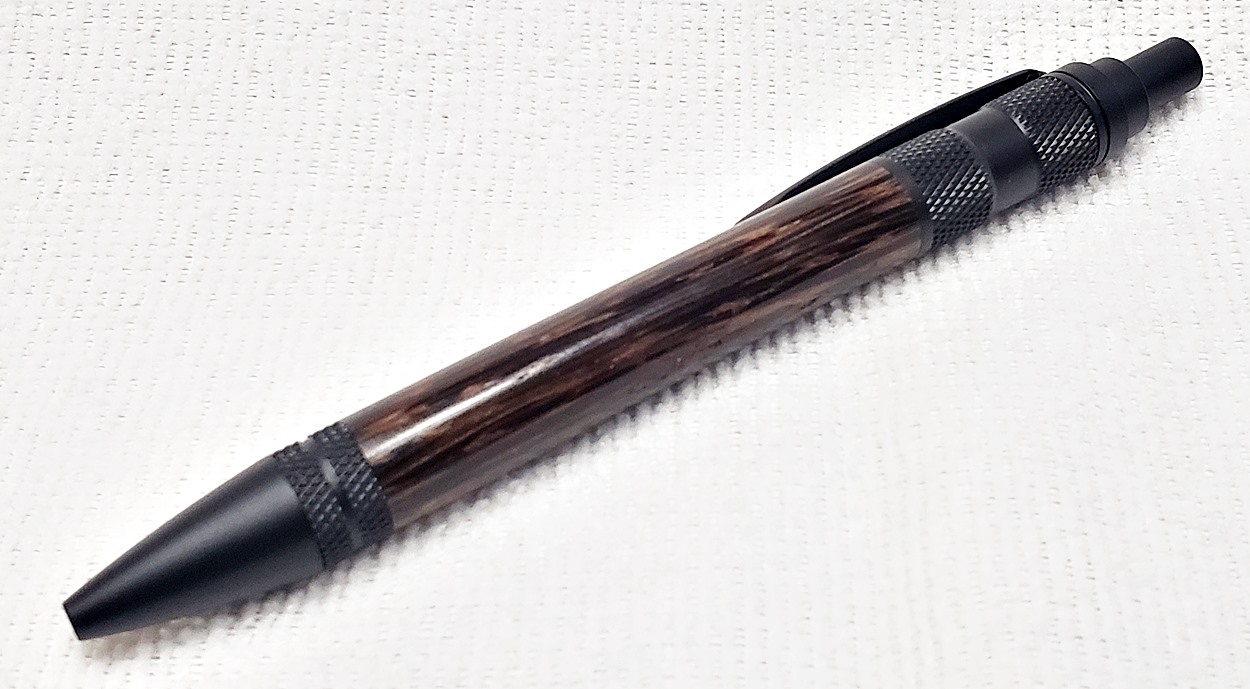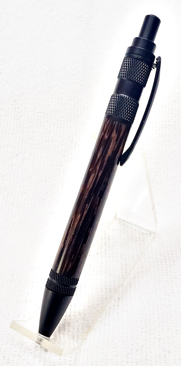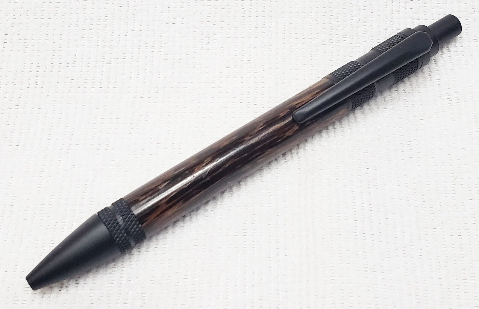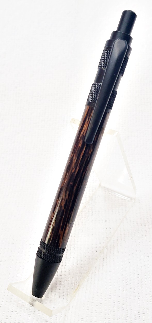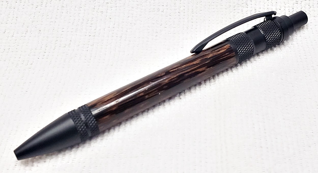 This is a Capital Click pen in matte black, from Woodturningz. I think it looks great with the black palm. I made it for my son, and he immediately put it in his pocket. Made me feel good.